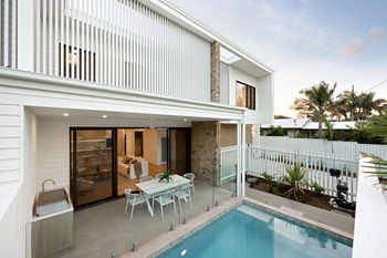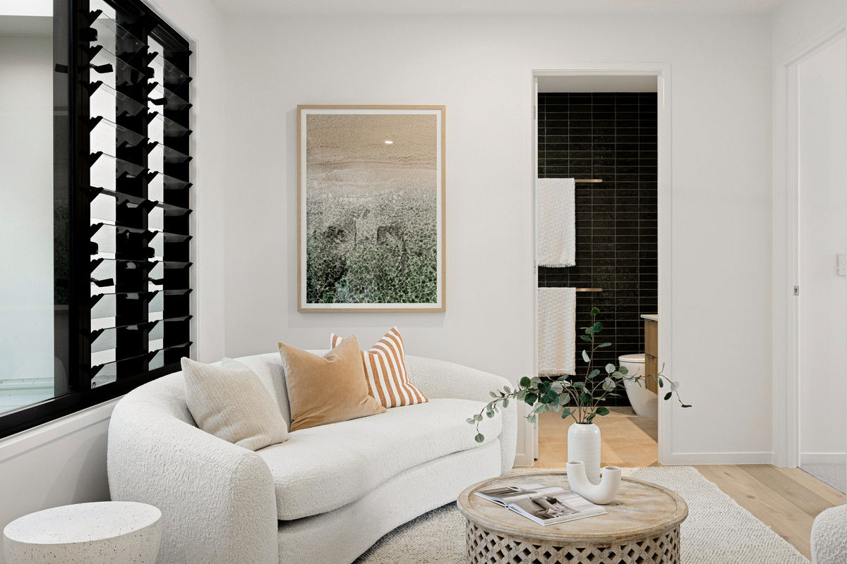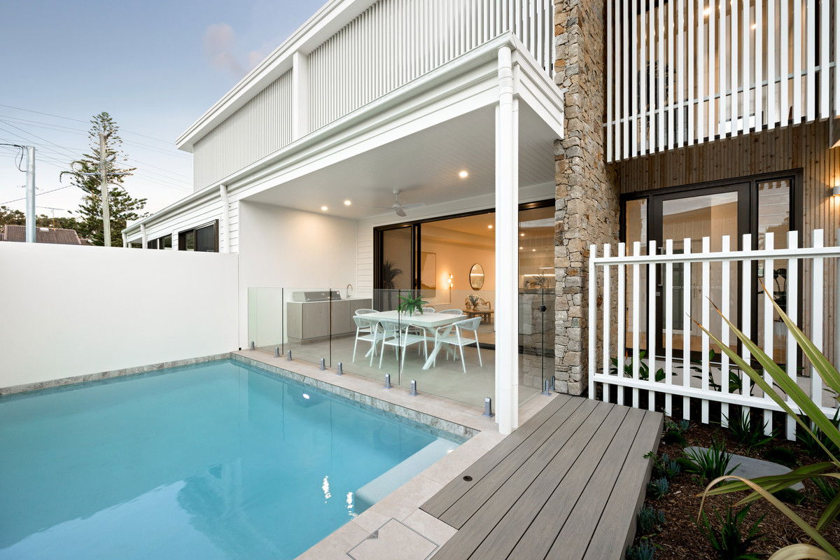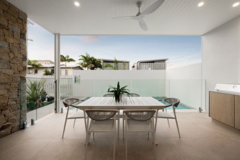 Designed for both entertaining and everyday comfort, the light-filled open-plan living flows effortlessly outdoors to a private poolside retreat. Floor-to-ceiling glass, louvres, and soaring ceilings invite sea breezes and natural light, while the striking alfresco zone, complete with built-in BBQ and mosaic feature wall, creates the perfect backdrop for weekend gatherings or quiet evenings at home.