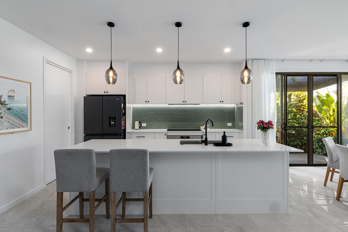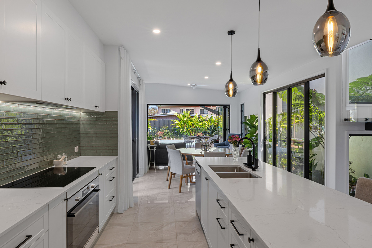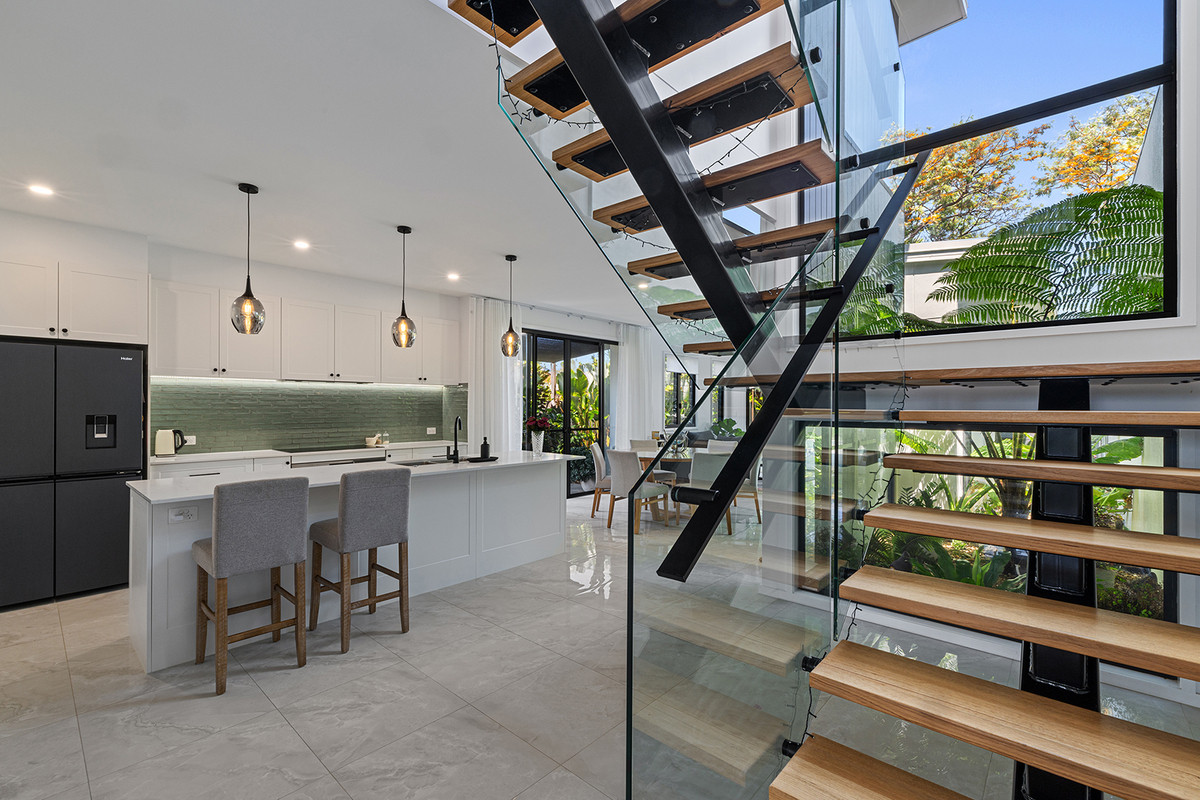 The interiors are elevated by a sophisticated palette of finishes that blend natural textures and soft tones, creating a timeless coastal aesthetic. Lush landscaping frames the outdoor spaces, with a large lawn and pool area providing a private sanctuary to relax, entertain, or soak up the Sunshine Coast lifestyle.