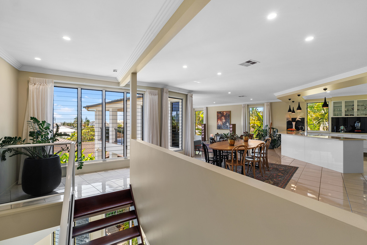 From the moment you arrive, the generous front entry and soaring ceilings establish a sense of space and quality. Natural light flows throughout the home, enhanced by louvre windows designed to capture cooling sea breezes. Multiple living zones across both levels allow the home to function effortlessly for families, guests or multigenerational living, while zoned ducted air-conditioning ensures year-round comfort.