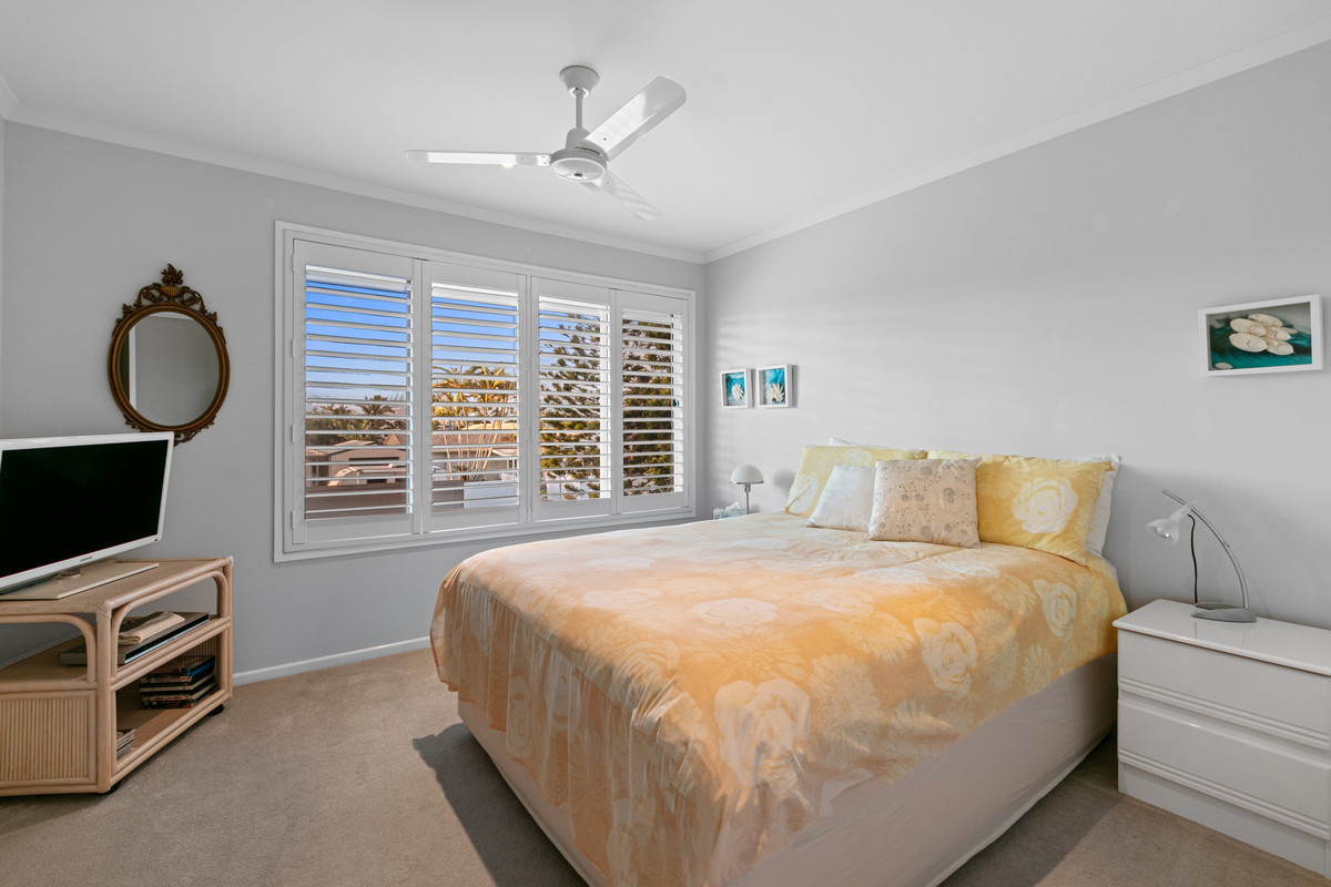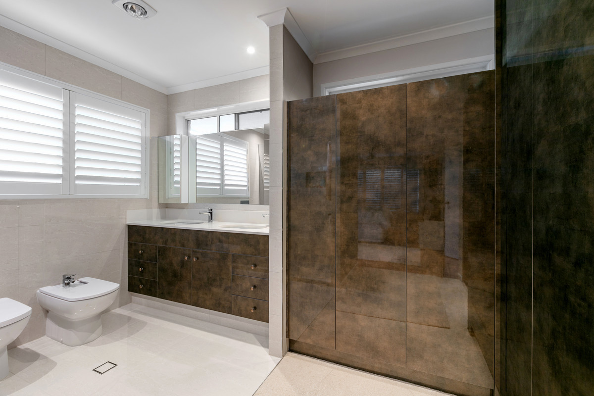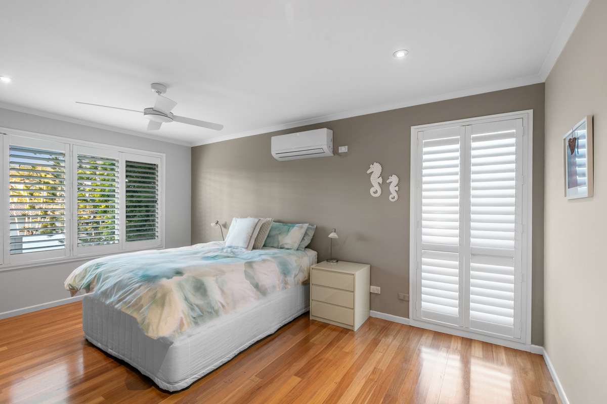 – Luxurious Master Suite: Upper-level master bedroom with walk-in robe, ensuite, plantation shutters, and split system air conditioning.