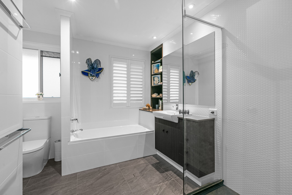 Step inside and discover the spacious interiors that accommodate four well-appointed bedrooms plus a study, perfect for working from home or converting into a fifth bedroom if needed. The upper level boasts a luxurious master suite complete with a walk-in robe (WIR), ensuite, and plantation shutters that frame the windows, allowing you to control the natural light and privacy with ease. Two additional bedrooms with built-in robes share a stylish bathroom equipped with a bathtub, while the lower level features a fourth bedroom and a versatile study.