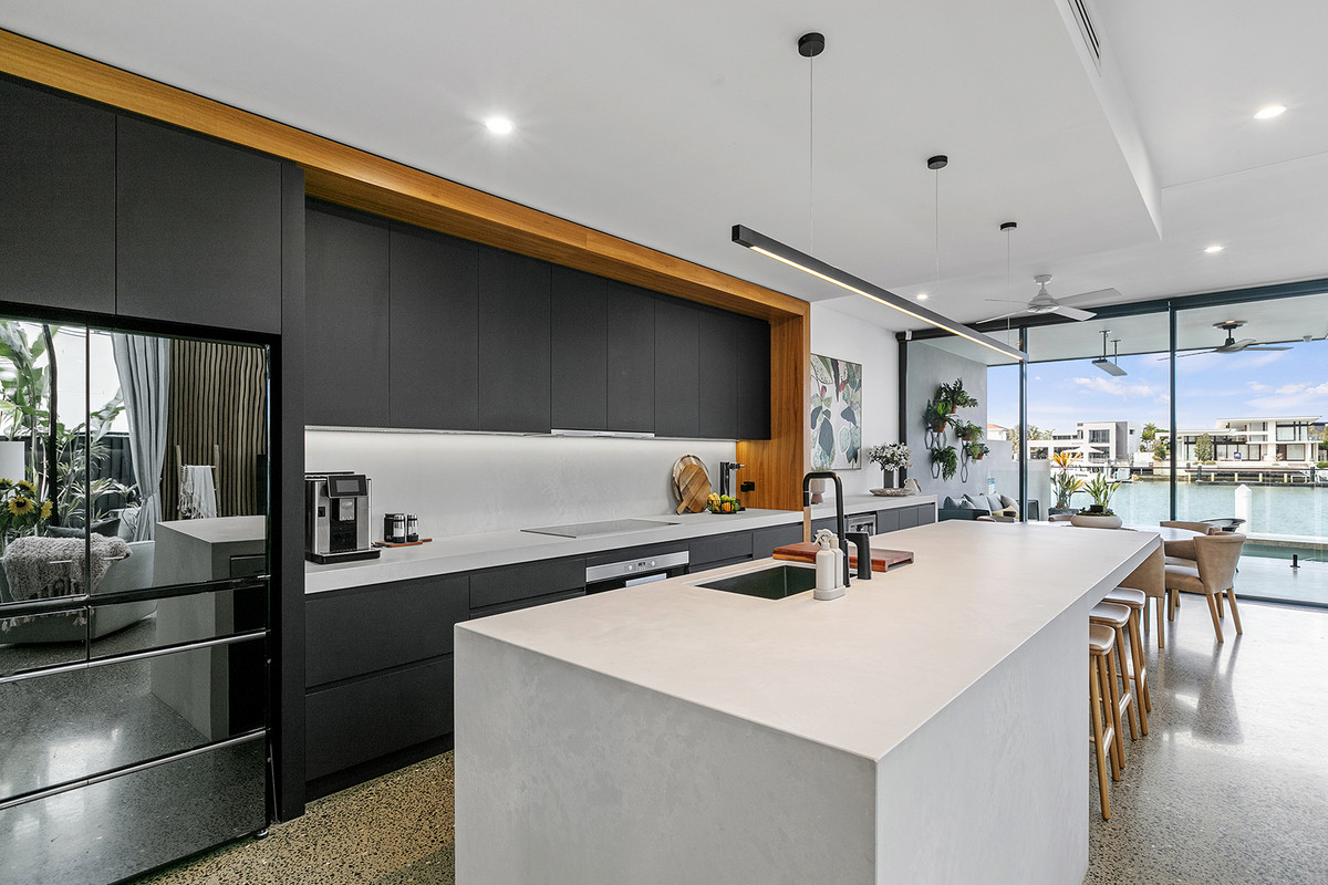 Upon entering, you are greeted by expansive floor-to-ceiling, high-grade glass panels and soaring six-meter voids, which not only frame captivating water views but also flood the interiors with natural light, creating an ambiance of space and serenity. The meticulously designed kitchen and bar are equipped with abundant integrated storage, a fully appointed butler’s pantry, premium European appliances, and flawless finishes. The diamond-polished concrete floors extend seamlessly to the generous alfresco area, where a private sparkling heated in-ground pool offers the perfect setting for both relaxation and entertaining.