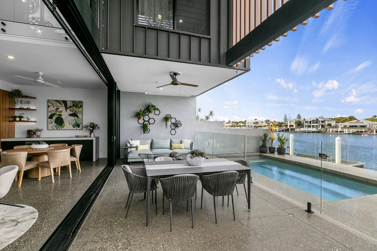 This stunning waterfront residence is perfectly positioned in one of Mooloolaba’s most coveted riverfront locations. Exceptionally designed, this multi-award-winning home epitomises luxury living, offering an unparalleled waterfront lifestyle with the convenience of low-maintenance elegance. Ideal for those seeking a refined retreat, this property features expansive living areas, state-of-the-art design, and the finest quality finishes, all set against a breathtaking waterfront backdrop.