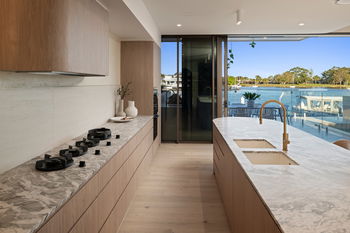 The entertainer’s kitchen is a true showpiece, a five-metre natural stone island sets the tone, paired with integrated appliances, a full butler’s pantry and artisan-finished splashbacks. Expansive living and dining zones flow through large stacker doors to the alfresco terrace, complete with built-in BBQ, wet bar and a sparkling north-facing plunge pool, perfect for year-round entertaining with uninterrupted water views.