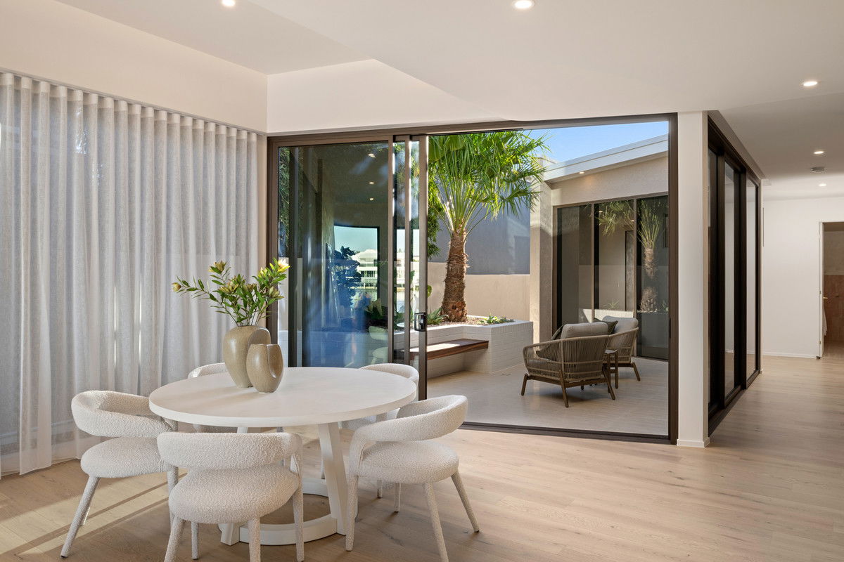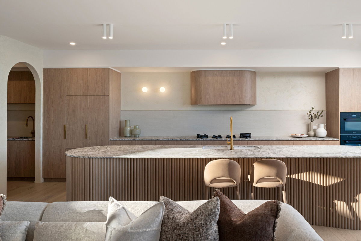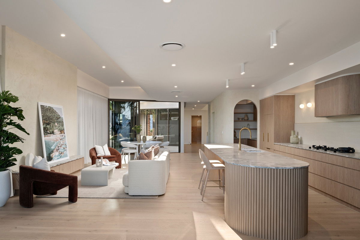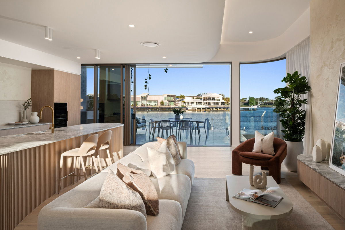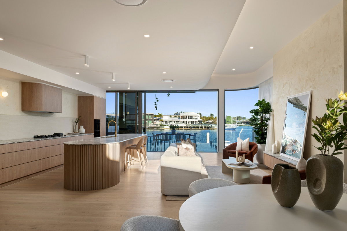 Designed by JSTN Architects and brought to life by Watermark Constructions, the home makes an immediate impression with its sculptural exterior, natural material palette and beautifully landscaped entry framed by travertine and lush greenery. At its heart, a central courtyard draws in soft light and fresh breezes, while warm textures and elegant curves echo the tranquillity of the river beyond.