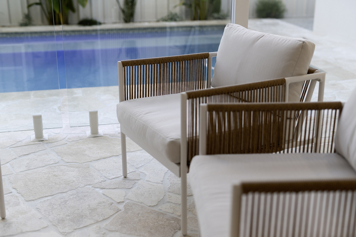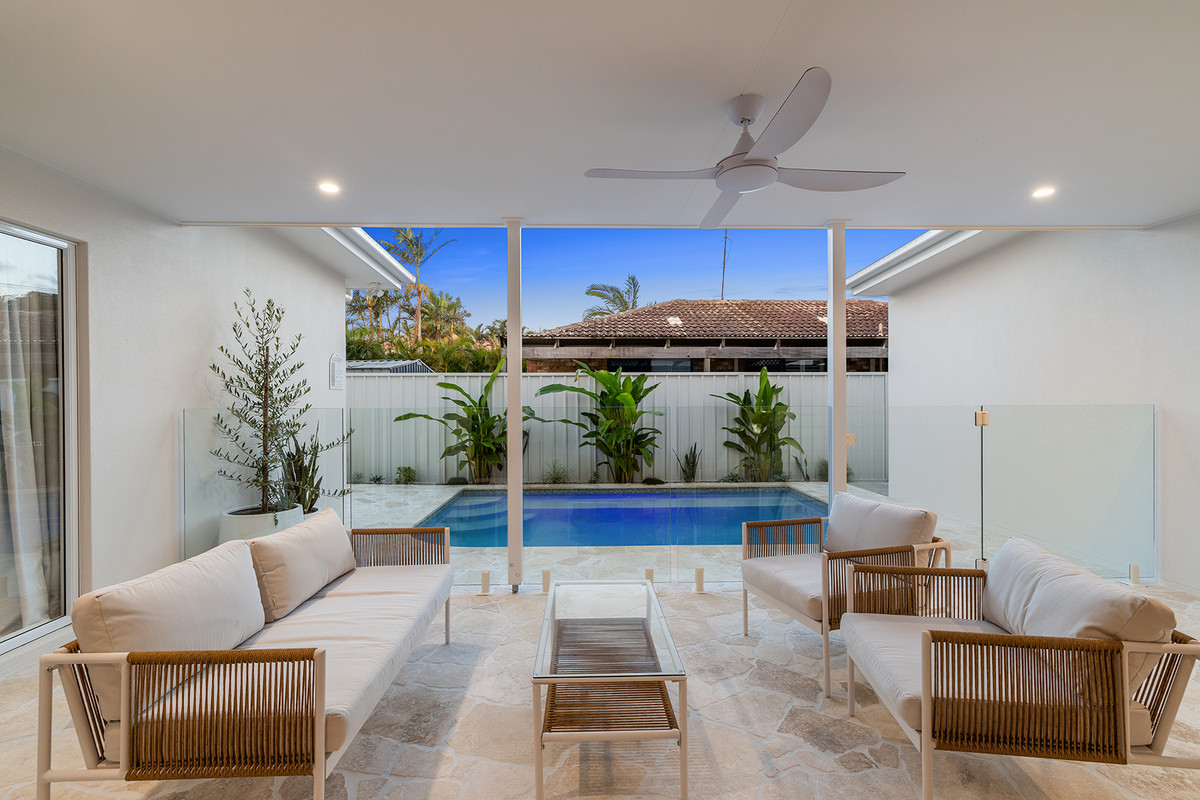 – East-facing alfresco and pool area with crazy pave travertine flooring