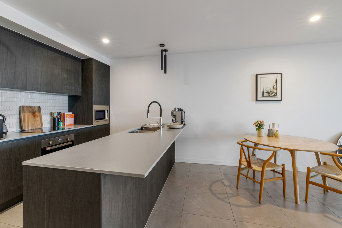 – Designer kitchen with premium European appliances, stone benchtops, LED and pendant lighting, custom cabinetry, and water-connected fridge space.