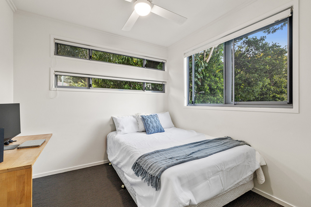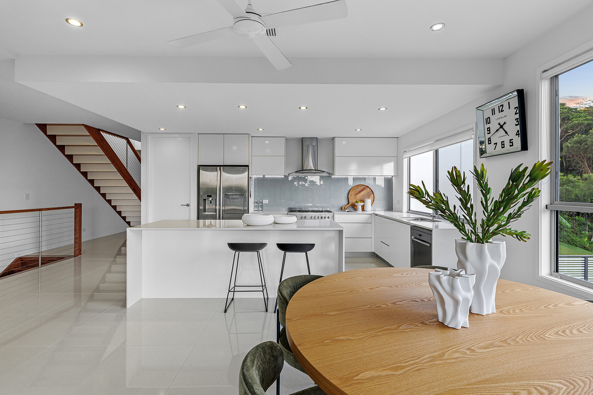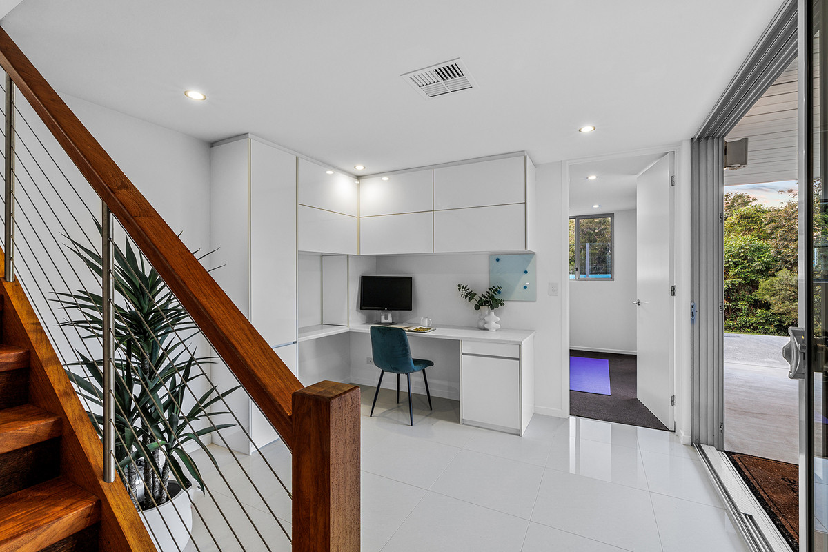 At the heart of the home, a solar-heated inground pool and expansive entertaining terrace create an inviting setting for hosting family and friends. Equally, it’s a place to unwind- enjoying birdsong by day and the quiet charm of visiting wallabies at dusk. Elevated to capture ocean glimpses from the private parents’ retreat, the home embraces its natural surroundings with understated elegance.