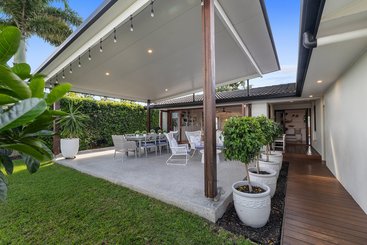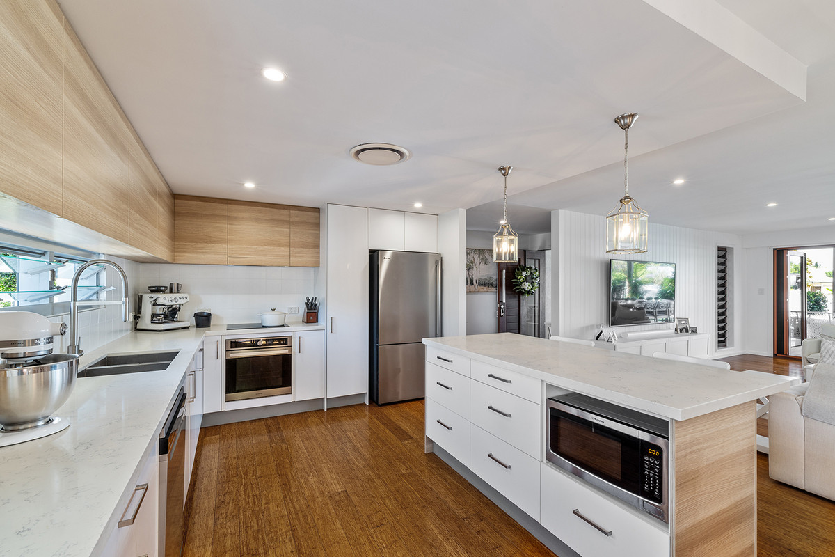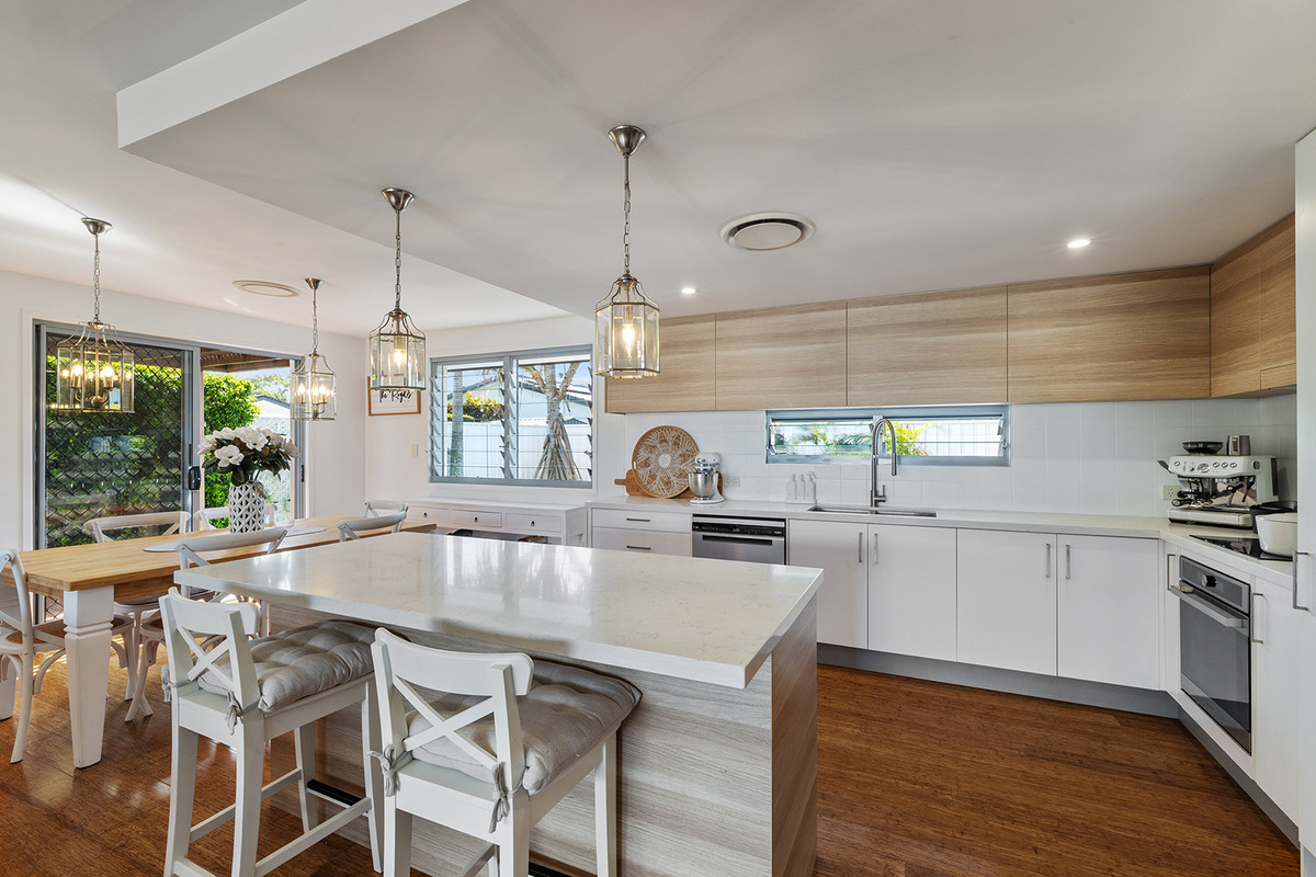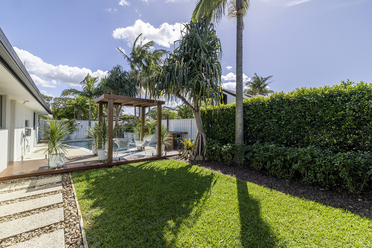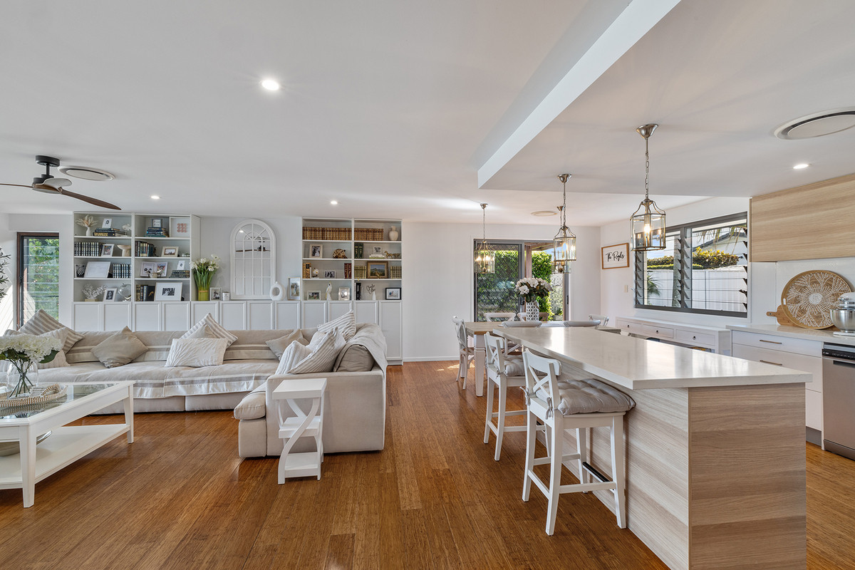 Behind a secure, gated entry, the home immediately sets the tone — lush tropical landscaping, hardwood timber decking and a considered design that balances style with everyday functionality. Inside, open plan living unfolds around a centrally positioned kitchen, finished with 40mm stone benchtops, quality appliances and excellent storage. Bathed in natural northern light, this is a space designed for both daily living and effortless entertaining.
