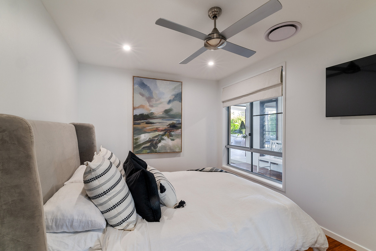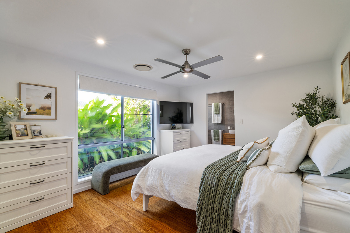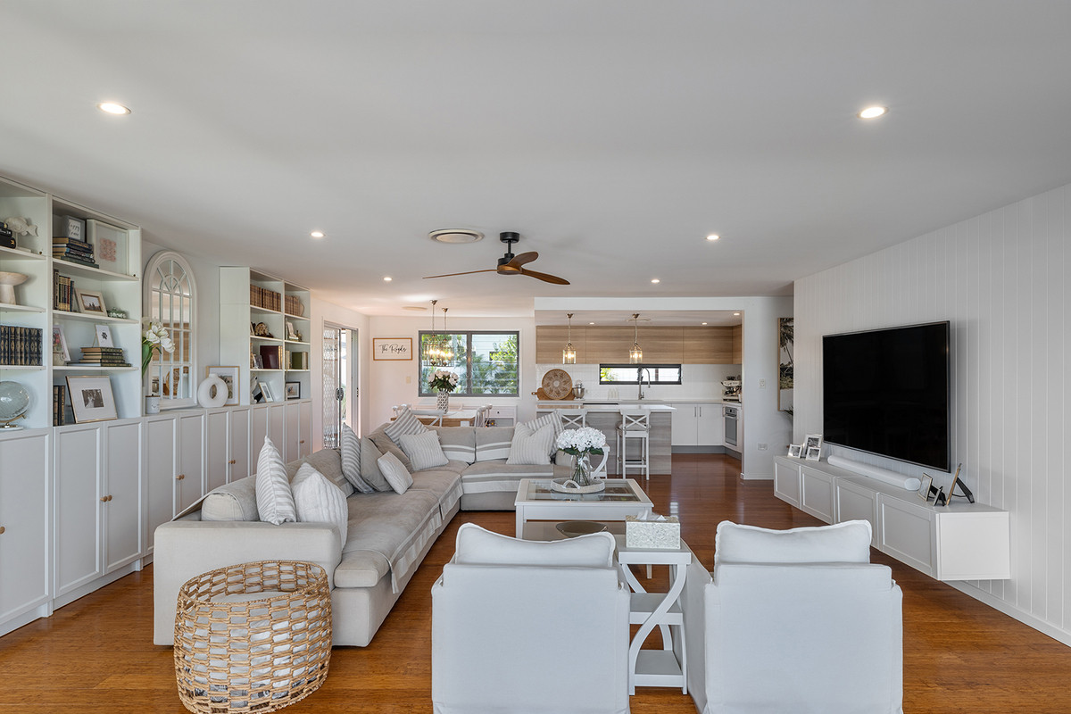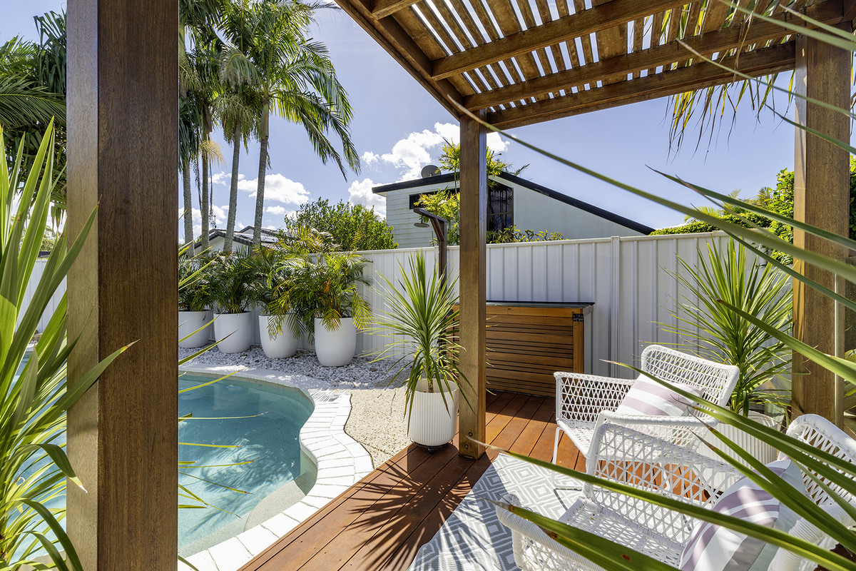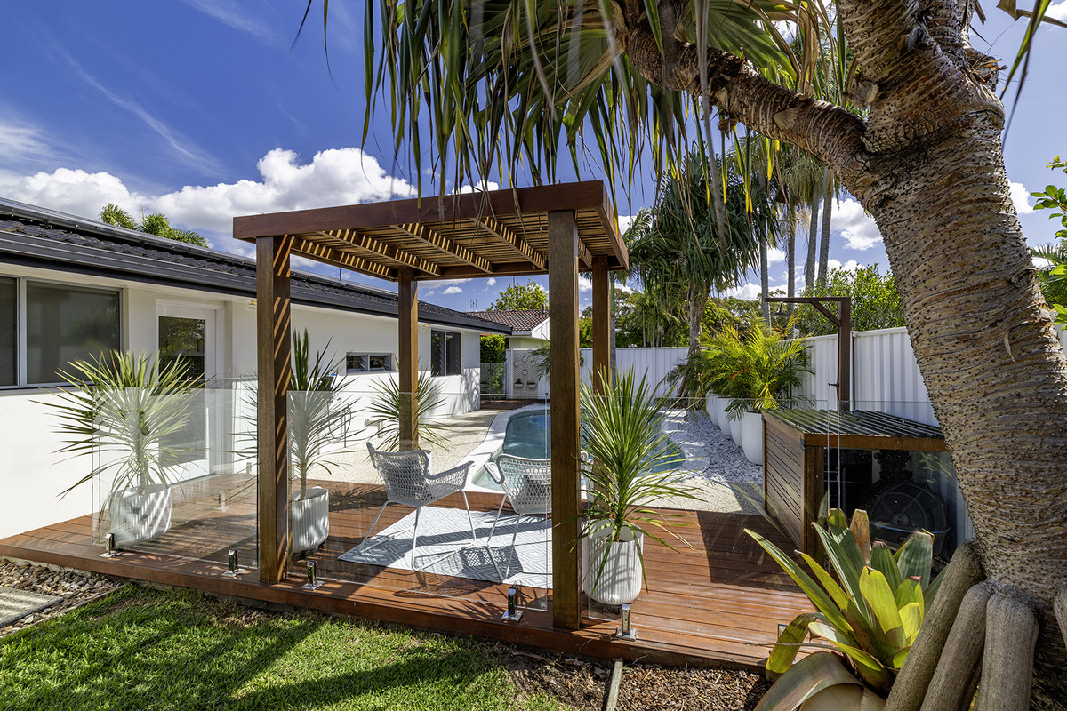 Behind a secure, gated entry, the home immediately sets the tone — lush tropical landscaping, hardwood timber decking and a considered design that balances style with everyday functionality. Inside, open plan living unfolds around a centrally positioned kitchen, finished with 40mm stone benchtops, quality appliances and excellent storage. Bathed in natural northern light, this is a space designed for both daily living and effortless entertaining.