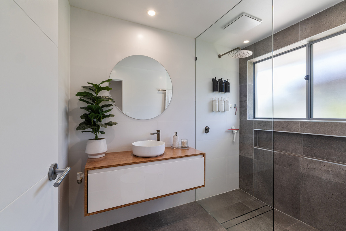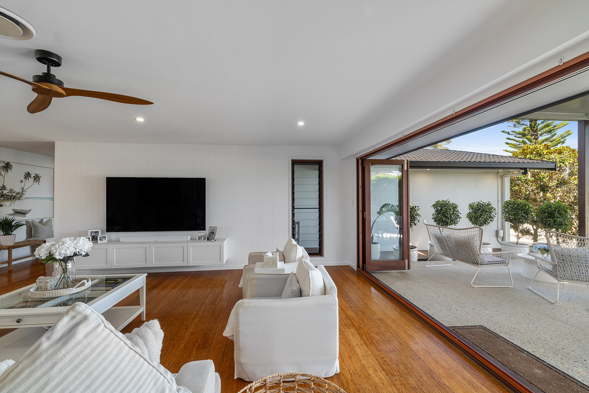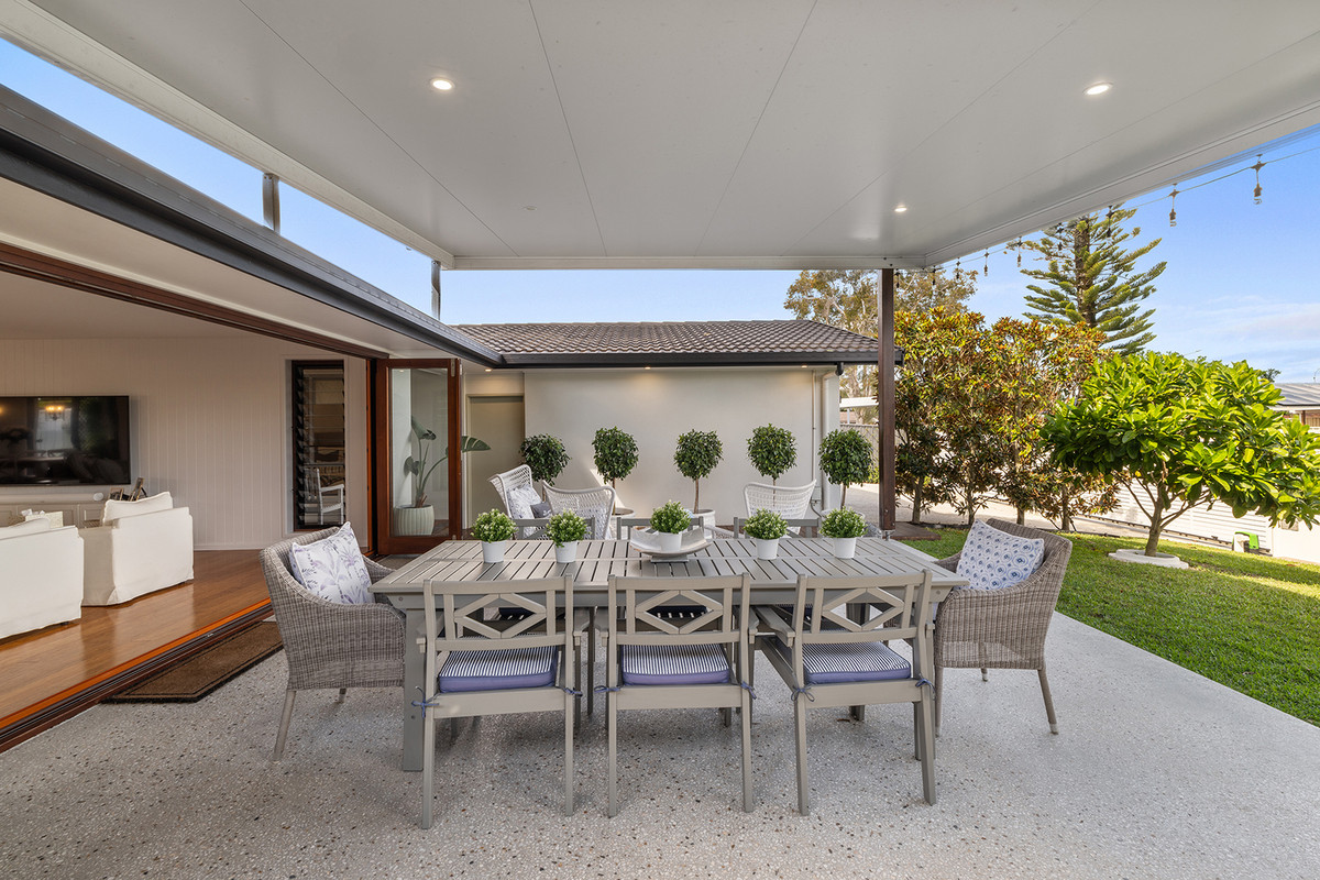 Large-scale living connects seamlessly to the outdoors via an expansive bi-fold opening, creating a true indoor-outdoor flow. The covered alfresco is a standout, complete with a polished concrete finish and framed by established gardens, offering exceptional privacy and a relaxed coastal feel.