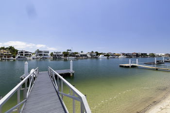 Inside, light-filled interiors are enhanced by raked ceilings, plantation shutters, stone benchtops, quality flooring and soft-close cabinetry. Additional highlights include high quality stainless-steel appliances, split-system air-conditioning, ceiling fans, solar power, abundant storage, and a 7 x 3 m pontoon with exclusive sandy beach—perfect for boating enthusiasts seeking quick, unrestricted ocean access in a private setting with no passing traffic or wash to deal with.
