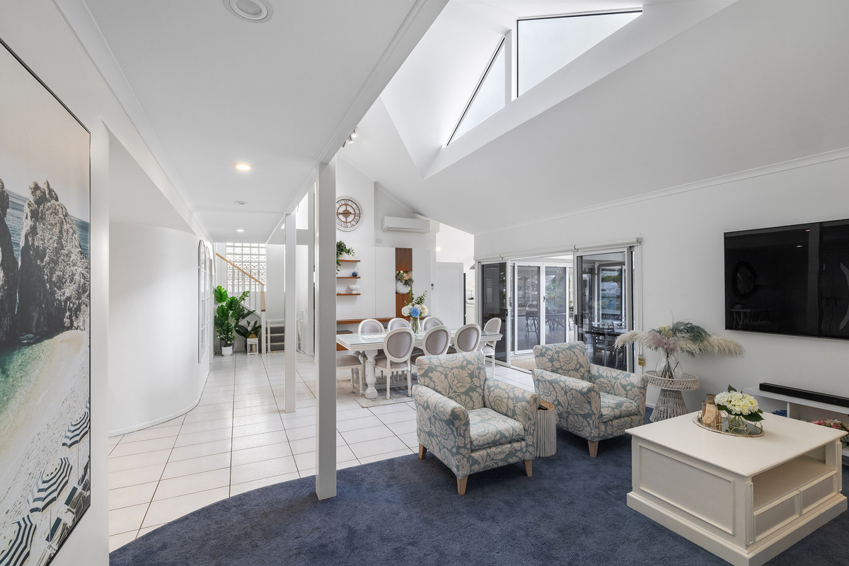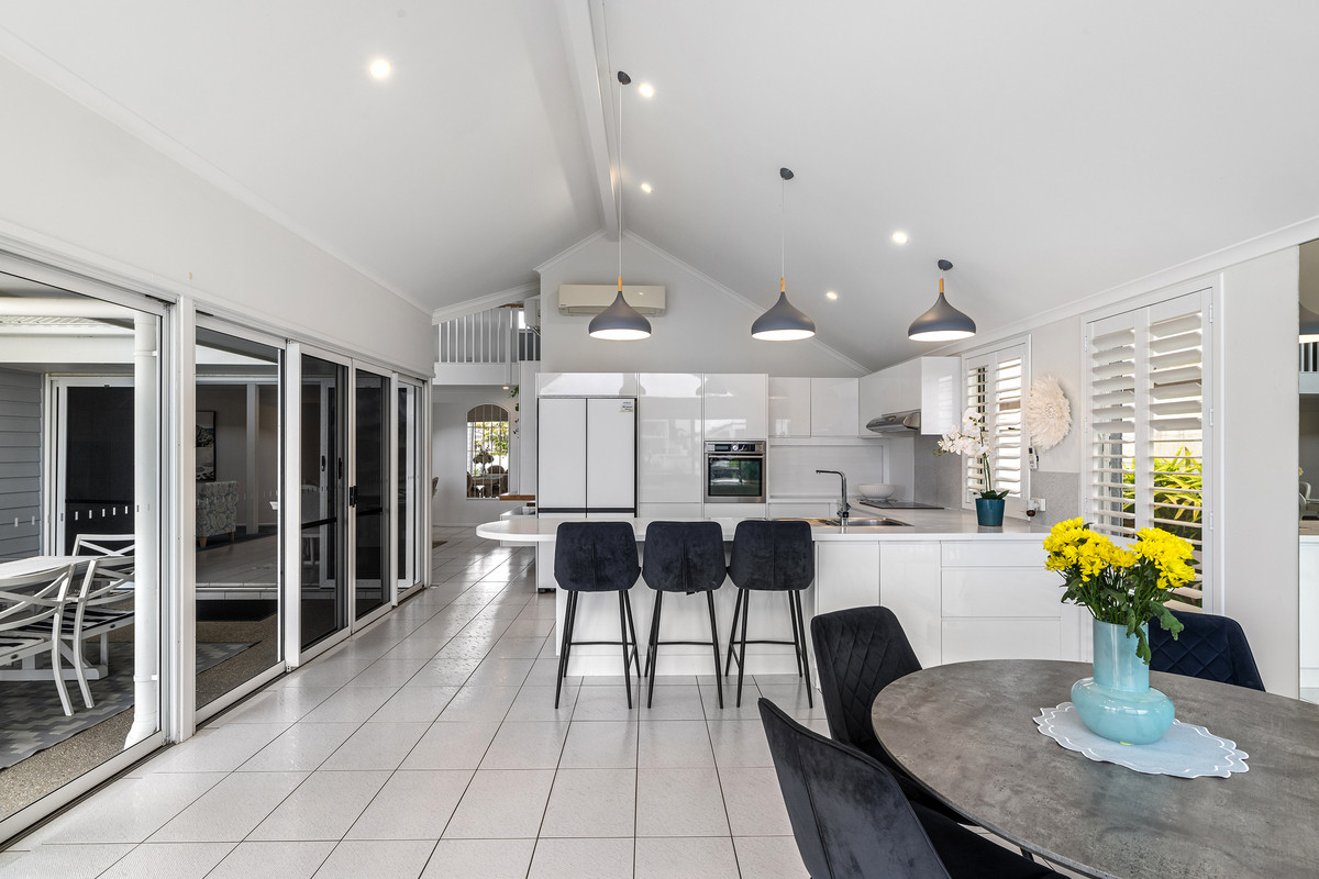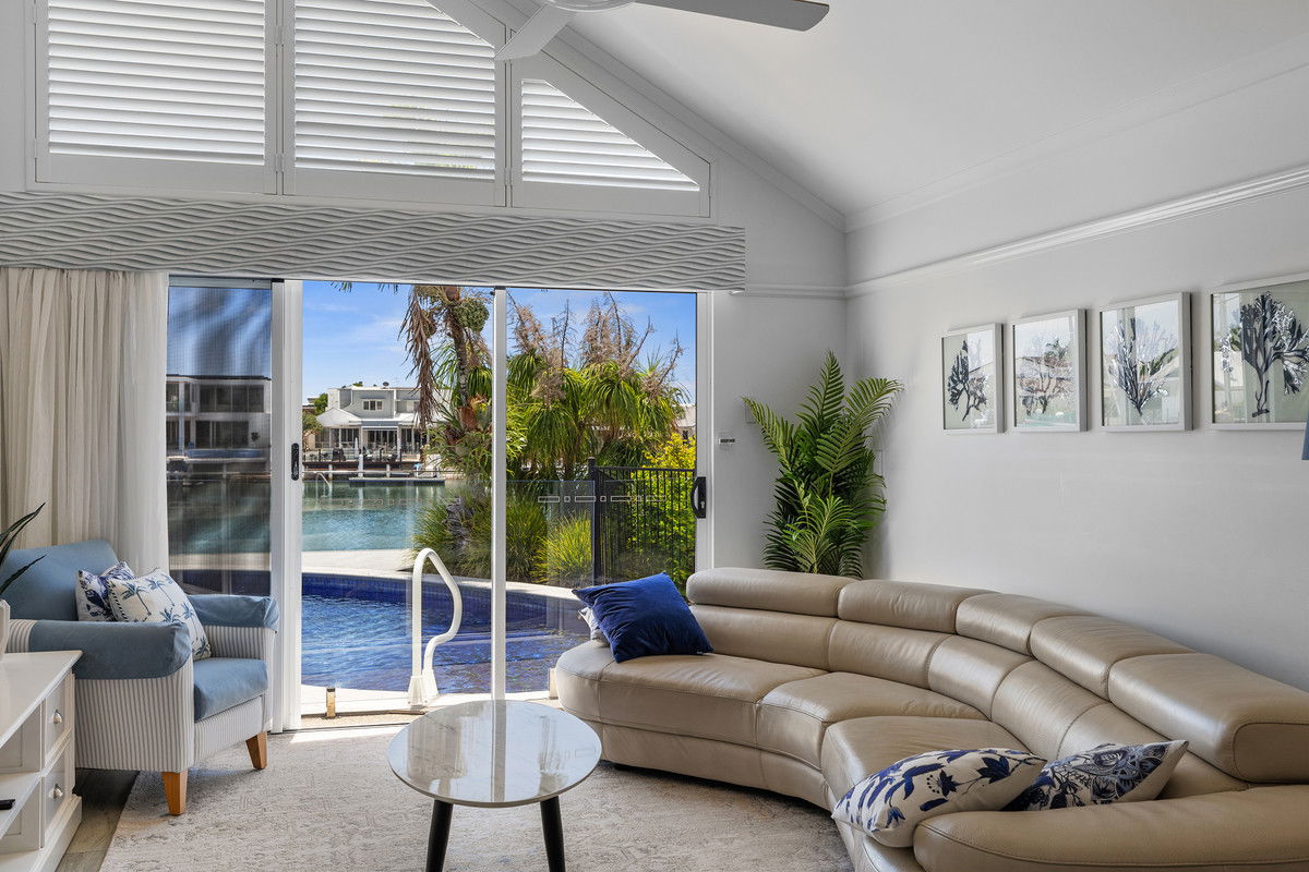 Inside, light-filled interiors are enhanced by raked ceilings, plantation shutters, stone benchtops, quality flooring and soft-close cabinetry. Additional highlights include high quality stainless-steel appliances, split-system air-conditioning, ceiling fans, solar power, abundant storage, and a 7 x 3 m pontoon with exclusive sandy beach—perfect for boating enthusiasts seeking quick, unrestricted ocean access in a private setting with no passing traffic or wash to deal with.