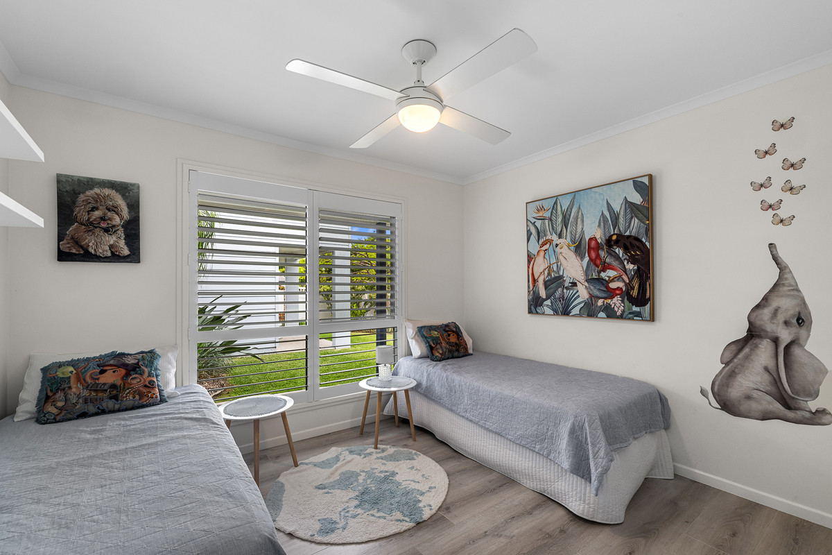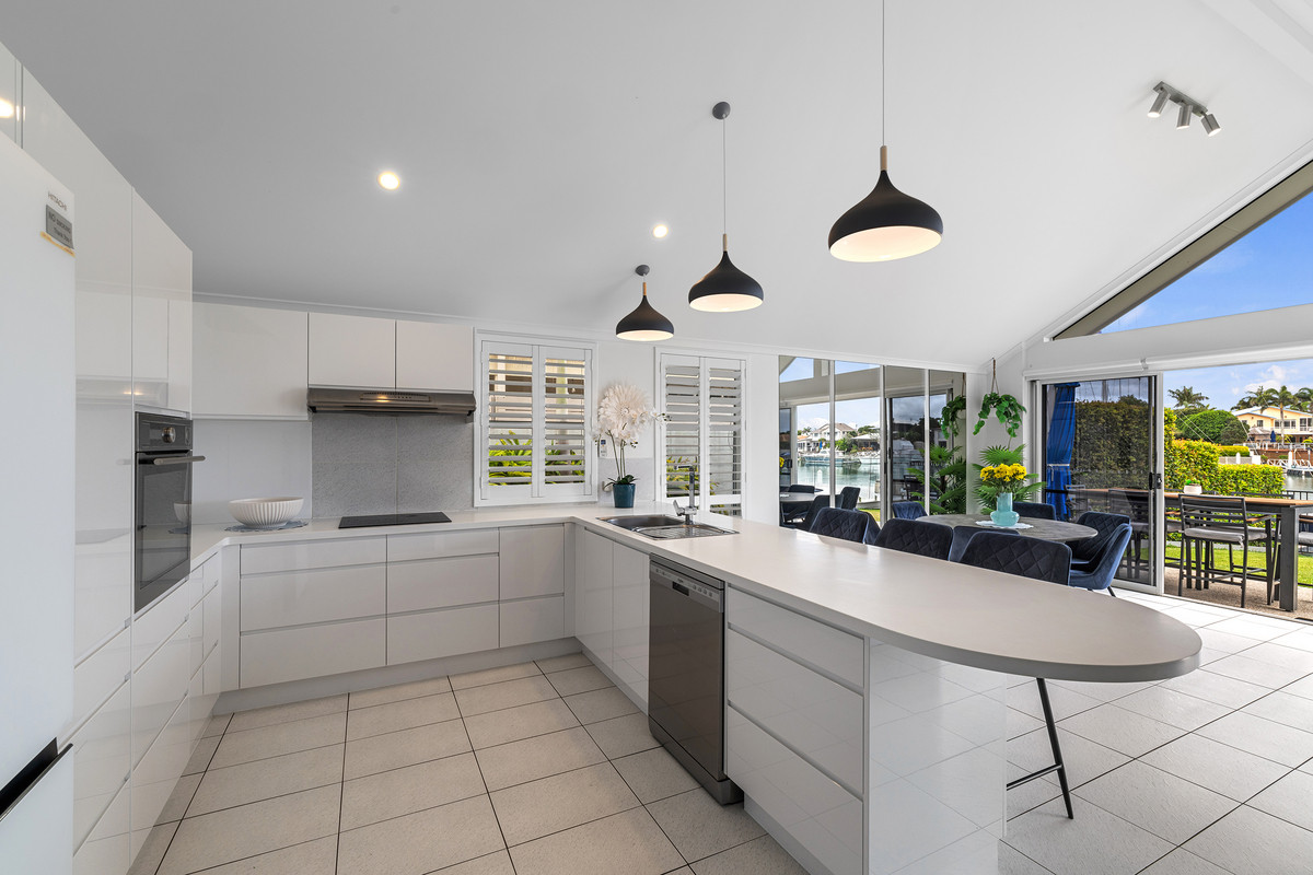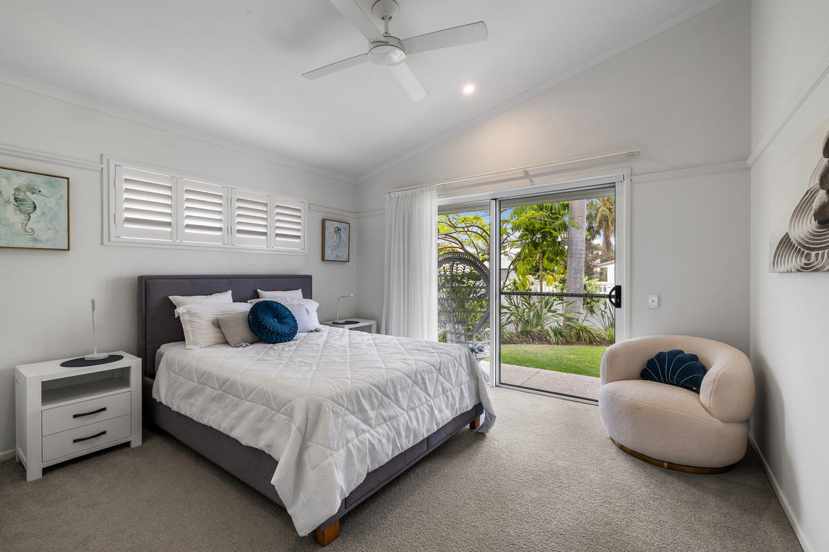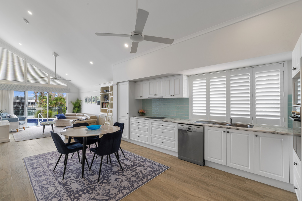 Inside, light-filled interiors are enhanced by raked ceilings, plantation shutters, stone benchtops, quality flooring and soft-close cabinetry. Additional highlights include high quality stainless-steel appliances, split-system air-conditioning, ceiling fans, solar power, abundant storage, and a 7 x 3 m pontoon with exclusive sandy beach—perfect for boating enthusiasts seeking quick, unrestricted ocean access in a private setting with no passing traffic or wash to deal with.