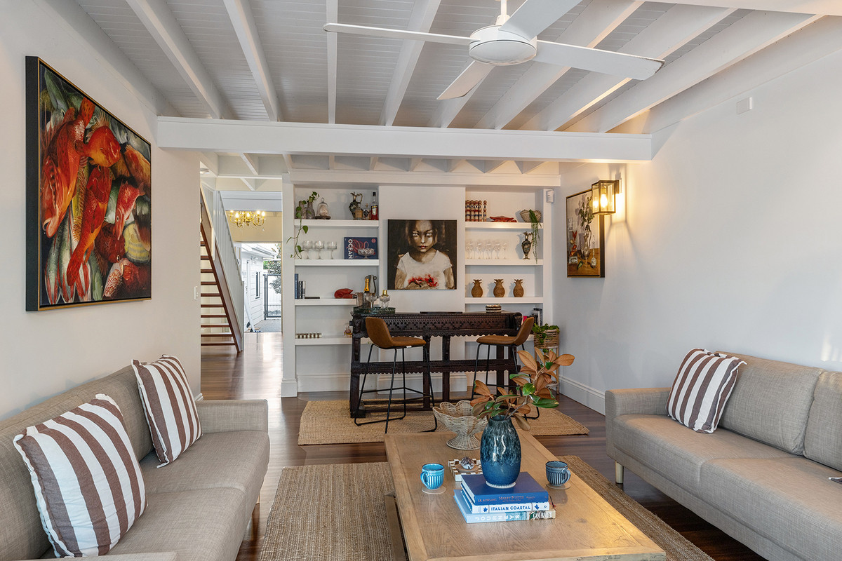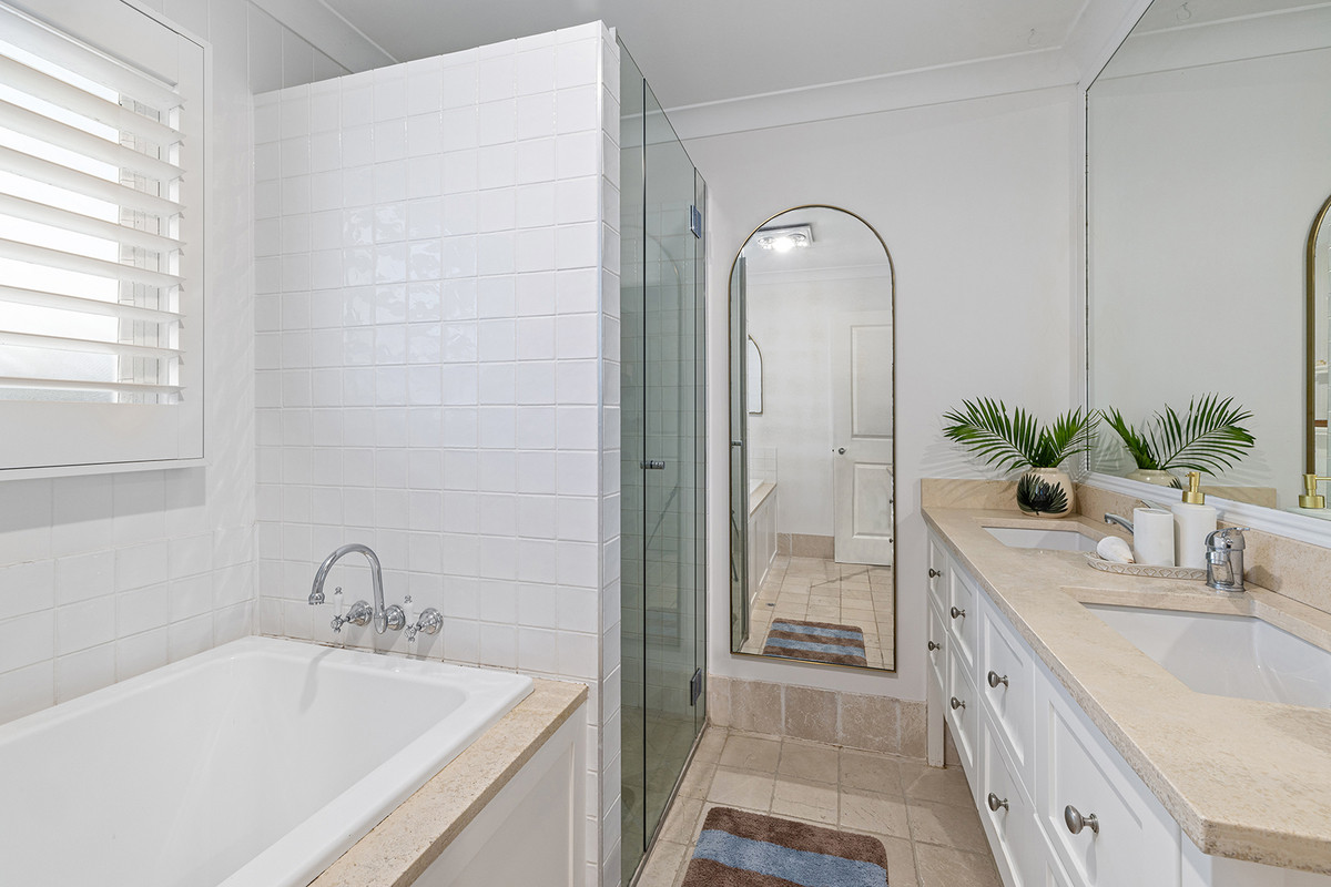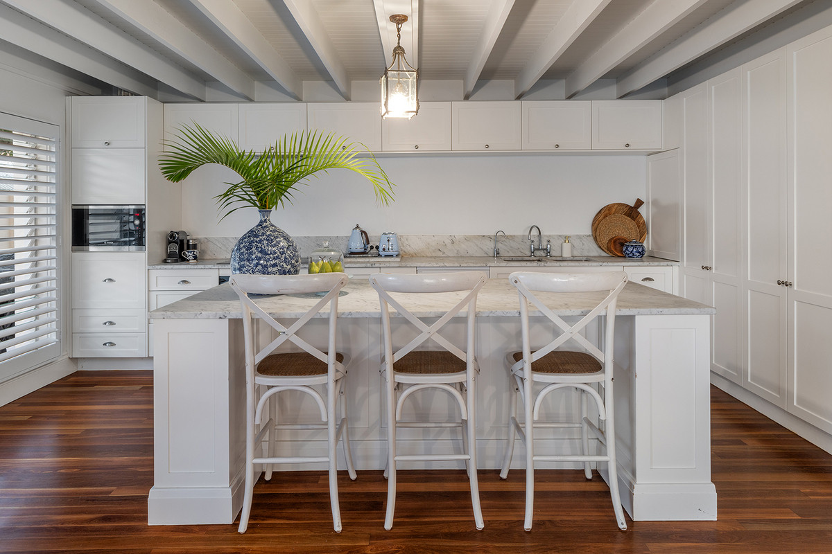 Crisp whites, timber accents and rich timber floors create a warm, inviting feel, while raked cathedral ceilings flood the ground floor with natural light. Designed for family living and entertaining, the home offers formal and informal living areas, plus a separate children’s rumpus.