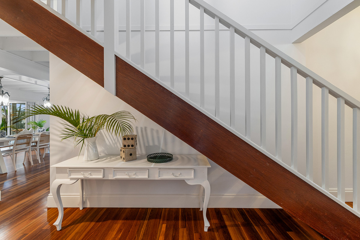 Upstairs, four spacious bedrooms enjoy abundant light. The master suite opens to the waterfront, capturing views toward the Mooloolaba skyline, complete with walk-in robe and ensuite — a peaceful private retreat.