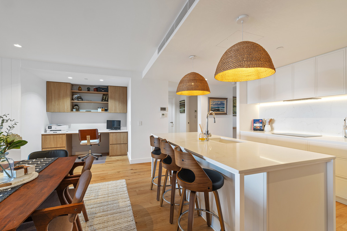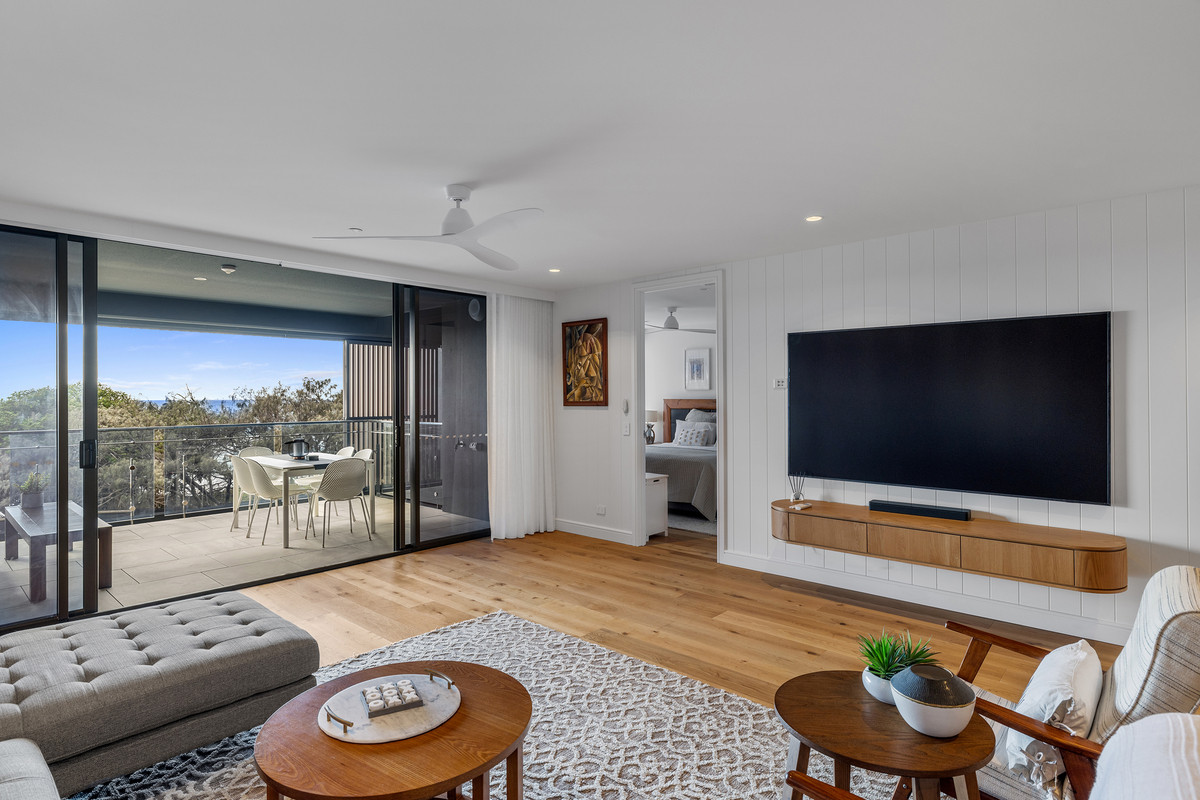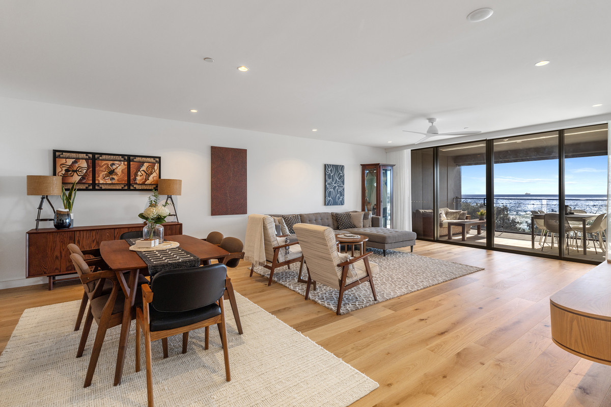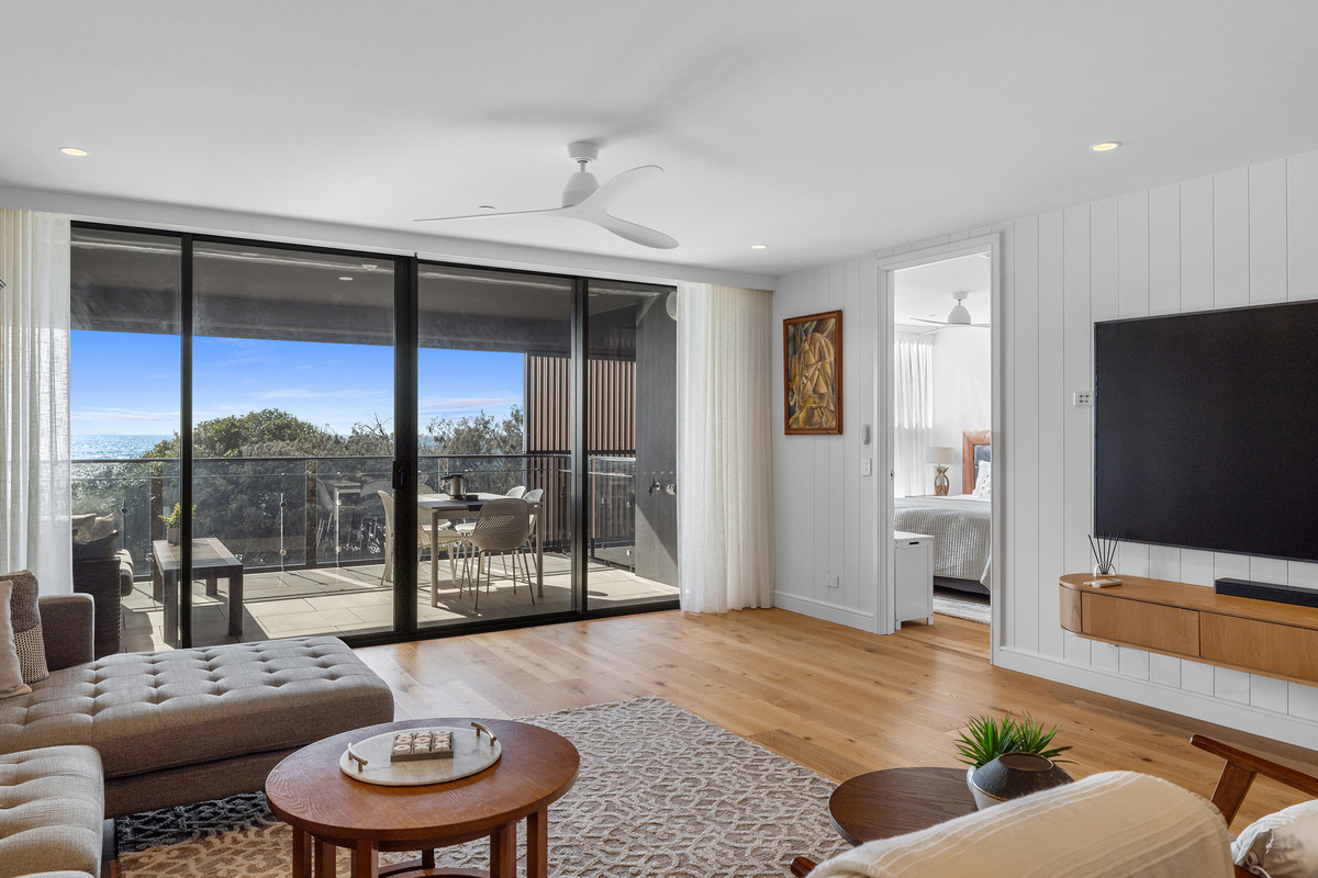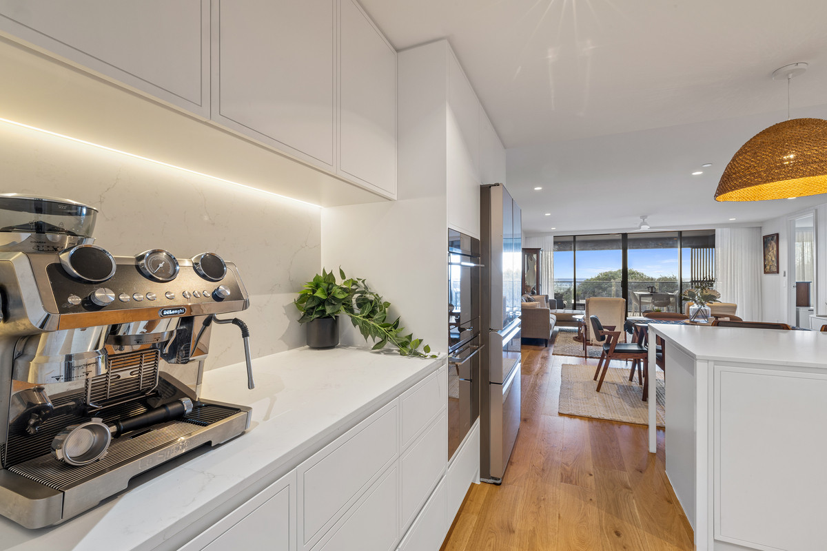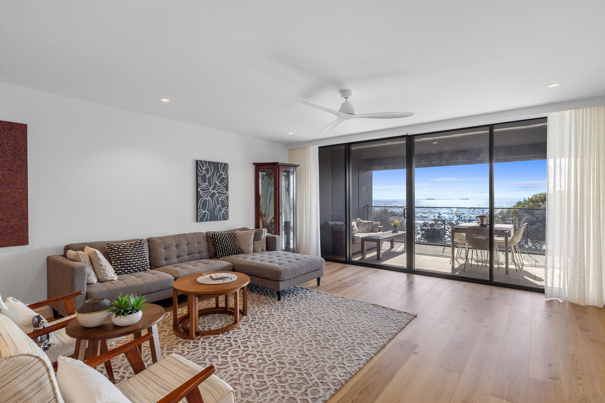 Inside, a refined coastal palette pairs effortlessly with generous proportions. Timber flooring flows through the expansive open-plan living and dining area, while floor-to-ceiling glass maximises natural light and frames the ever-changing ocean outlook. Large sliding doors create a seamless transition to the balcony, inviting sea breezes and outdoor living year-round.