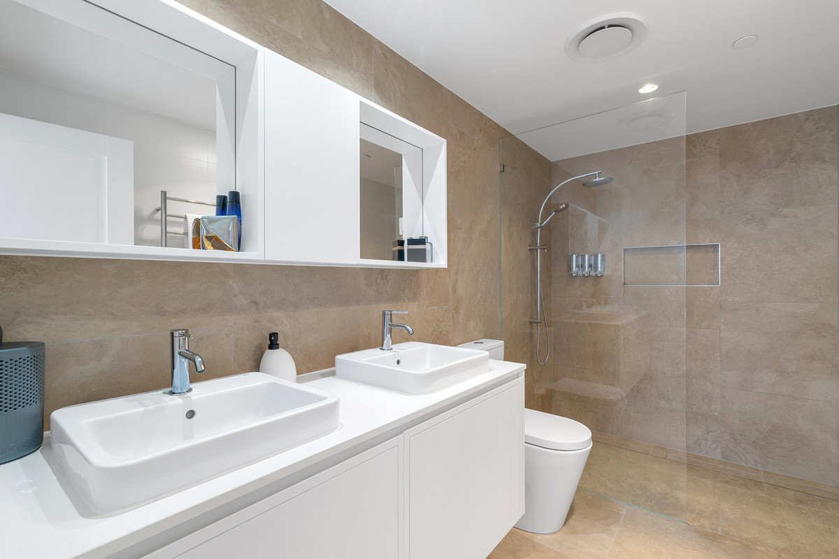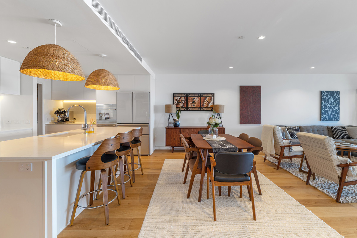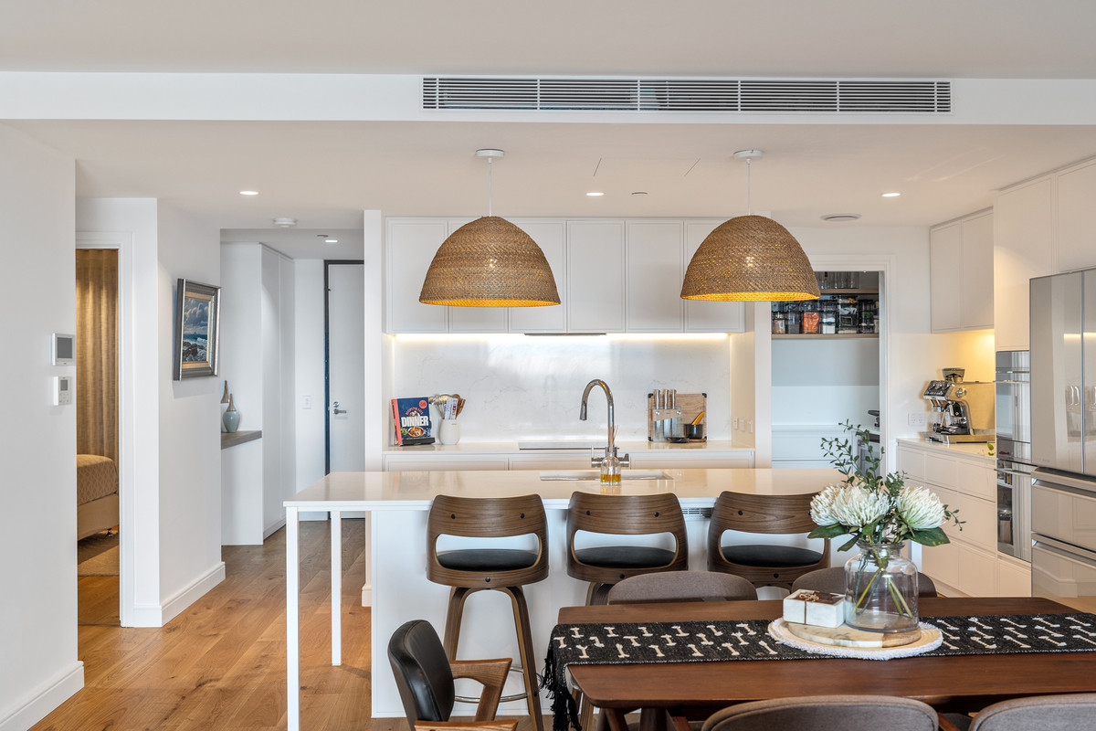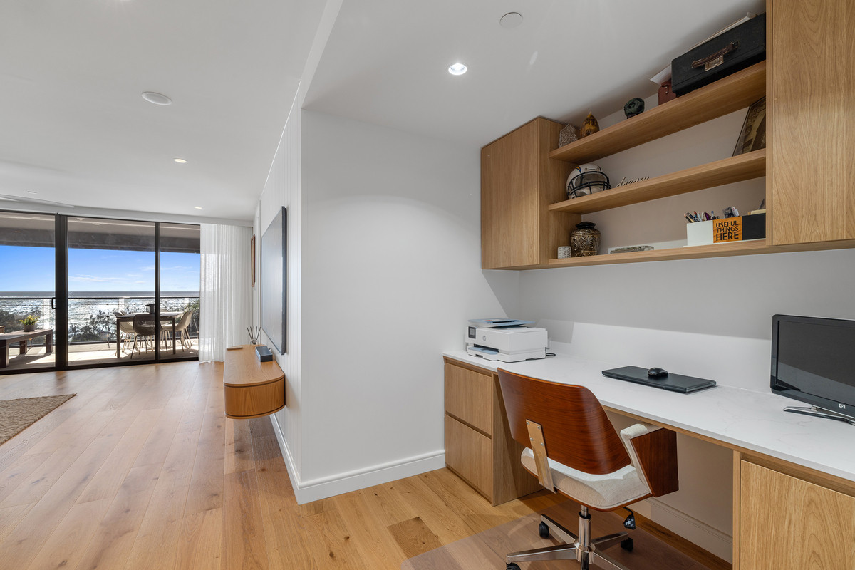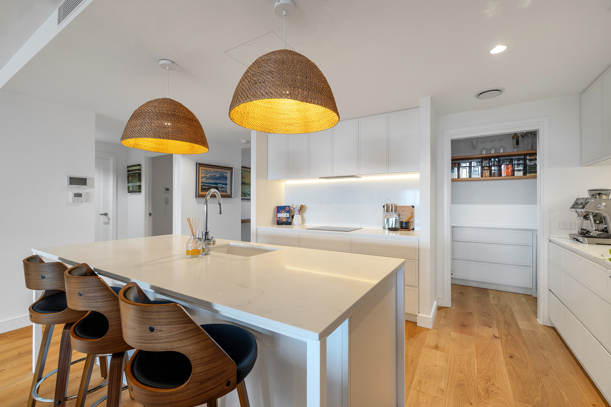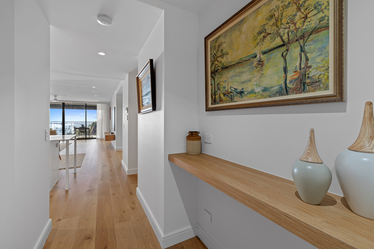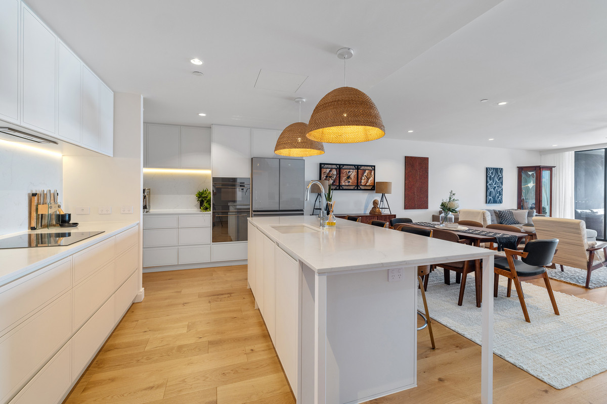 Inside, a refined coastal palette pairs effortlessly with generous proportions. Timber flooring flows through the expansive open-plan living and dining area, while floor-to-ceiling glass maximises natural light and frames the ever-changing ocean outlook. Large sliding doors create a seamless transition to the balcony, inviting sea breezes and outdoor living year-round.