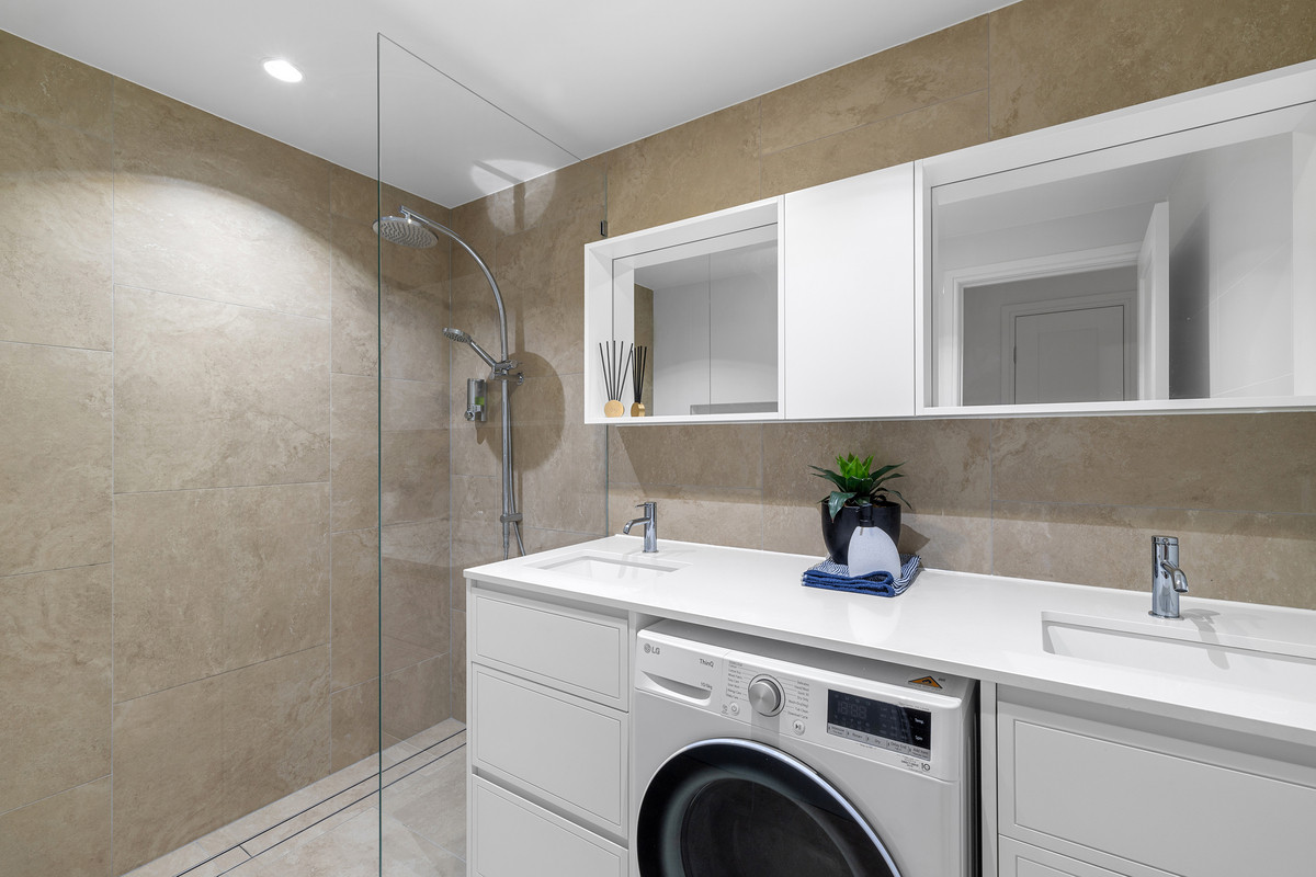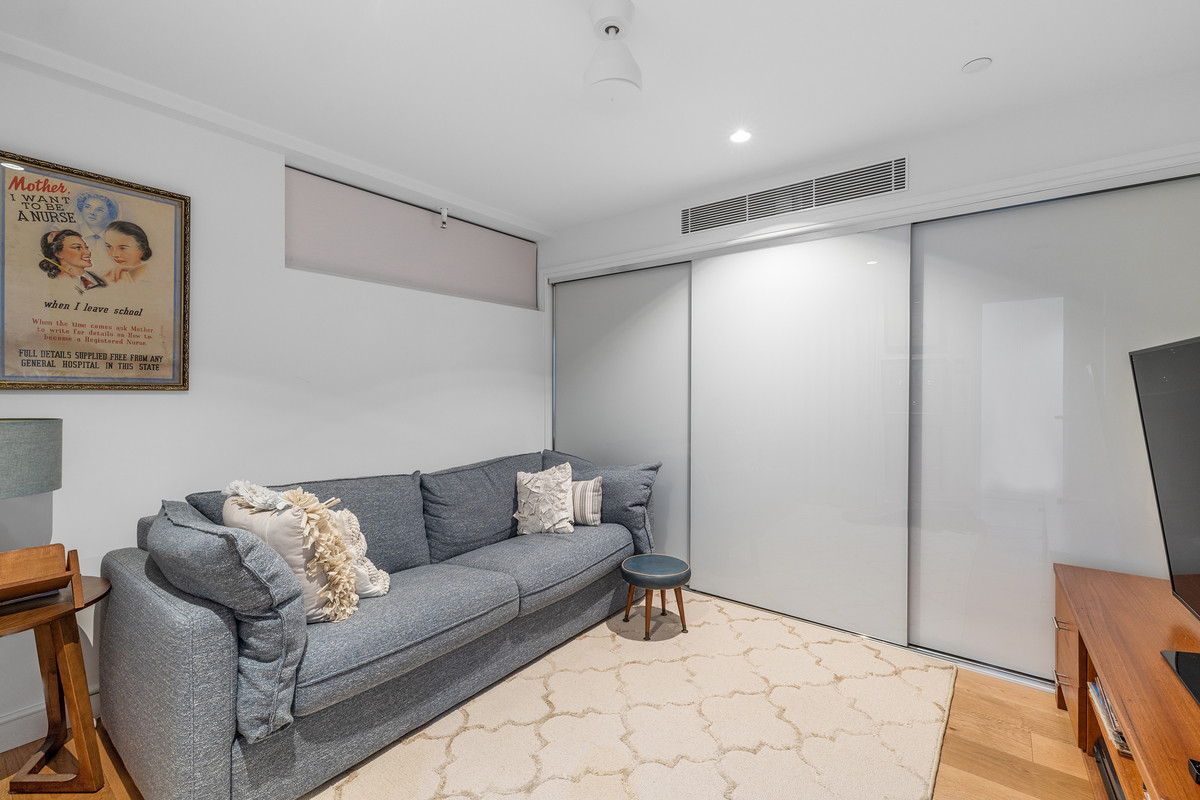 The designer kitchen balances functionality with understated luxury, appointed with premium Smeg appliances including oven, integrated dishwasher and wine fridge, along with a Zip tap delivering boiling, chilled and sparkling water. Sleek cabinetry and ample bench space ensure the space is equally suited to entertaining and everyday living.