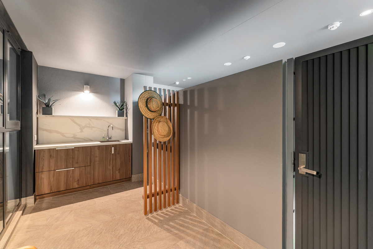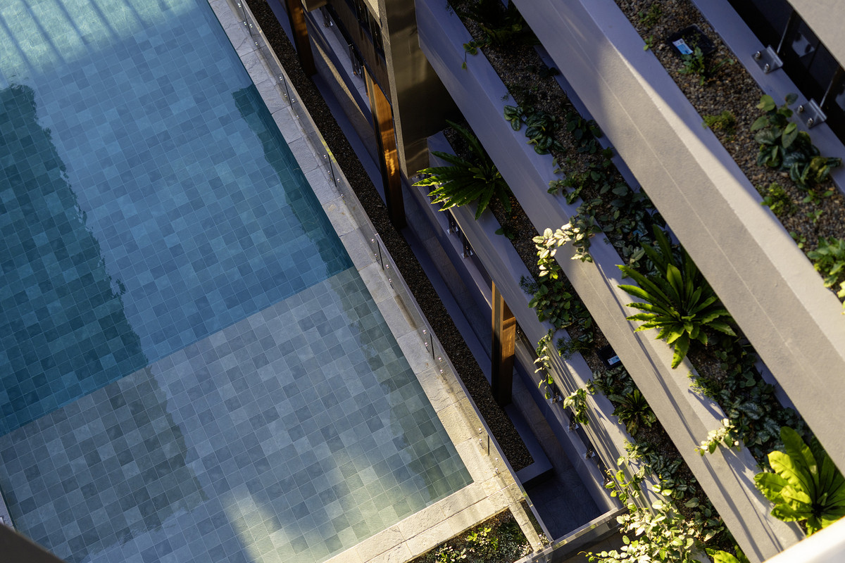 Residents enjoy exclusive access to a fully tiled, resort-style swimming pool inspired by relaxed coastal design — a private oasis just moments from the sand.