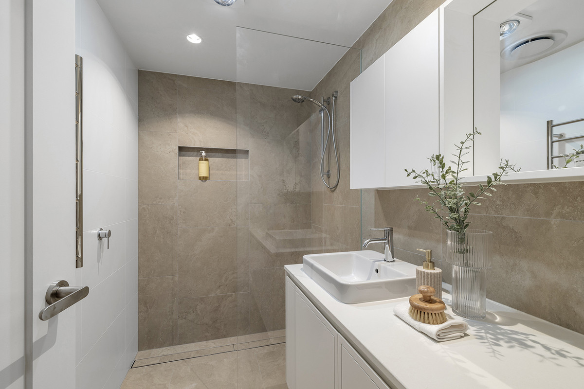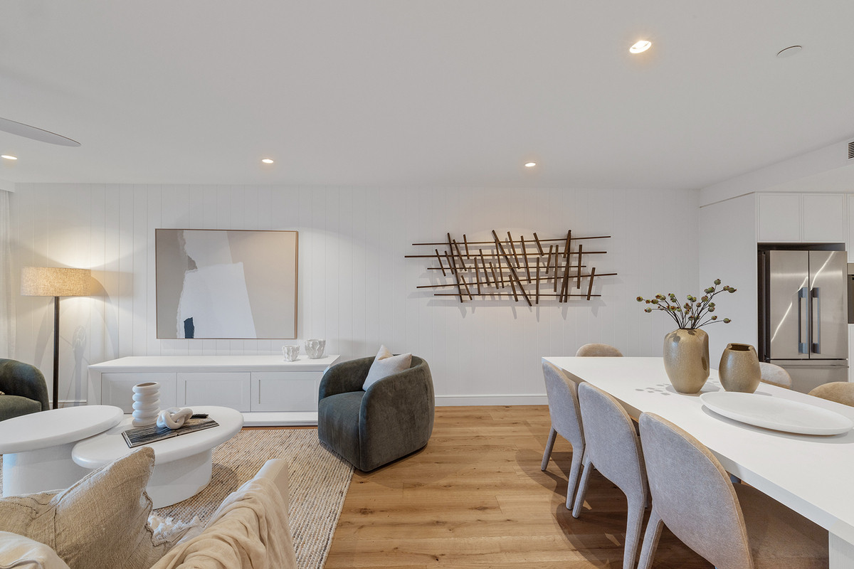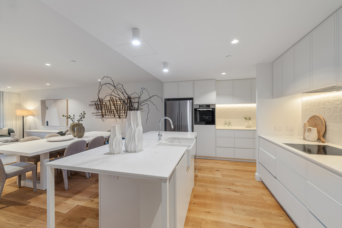 Inside, contemporary elegance meets timeless quality. The designer kitchen features Miele appliances, including a wine fridge, oven, and integrated dishwasher, all set against rich timber flooring and expansive open-plan living. The layout includes three generous bedrooms, highlighted by a stunning master suite with a large walk-in robe and ensuite, plus a beautifully appointed main bathroom. Thoughtful design provides excellent internal storage throughout the apartment, while floor-to-ceiling glass creates a seamless indoor-outdoor connection, allowing the ocean outlook and sea breezes to become part of everyday living. Two secure car spaces complete this outstanding offering.