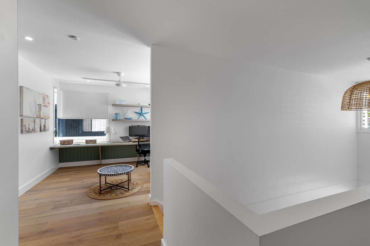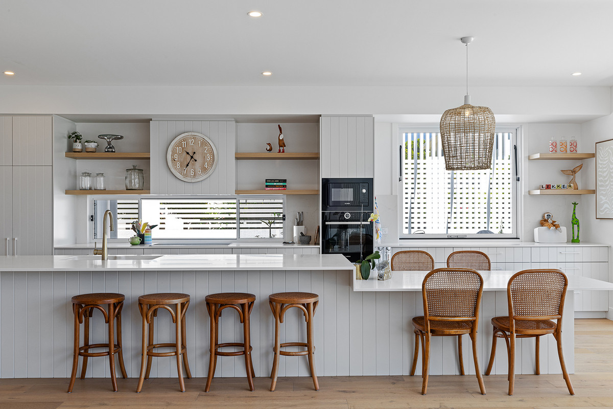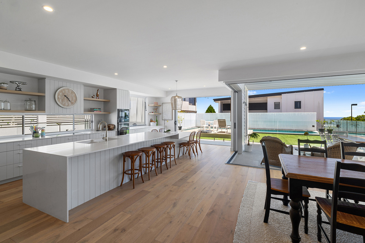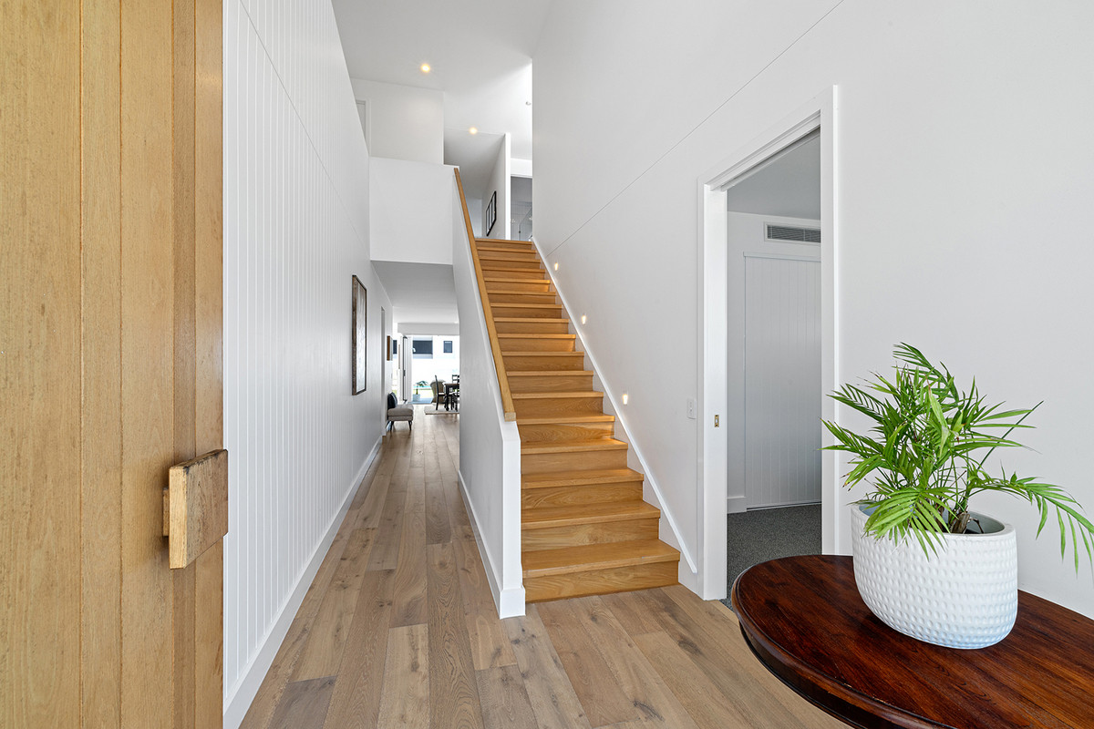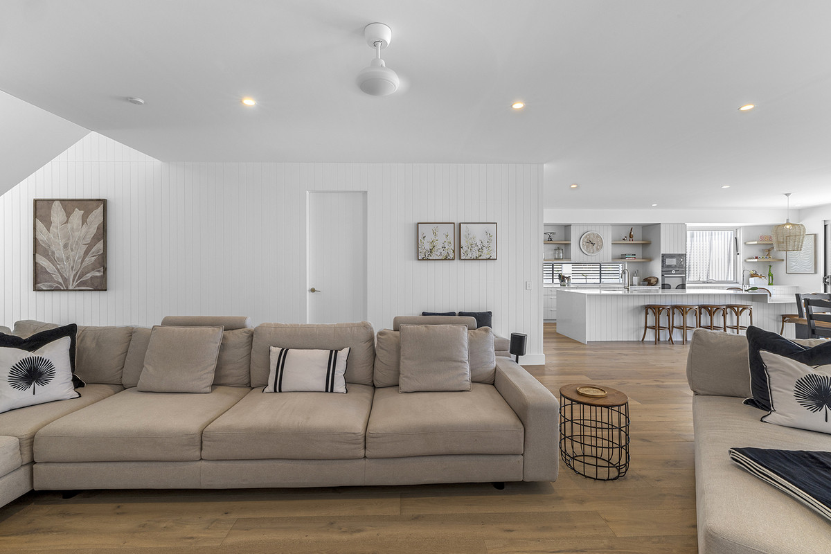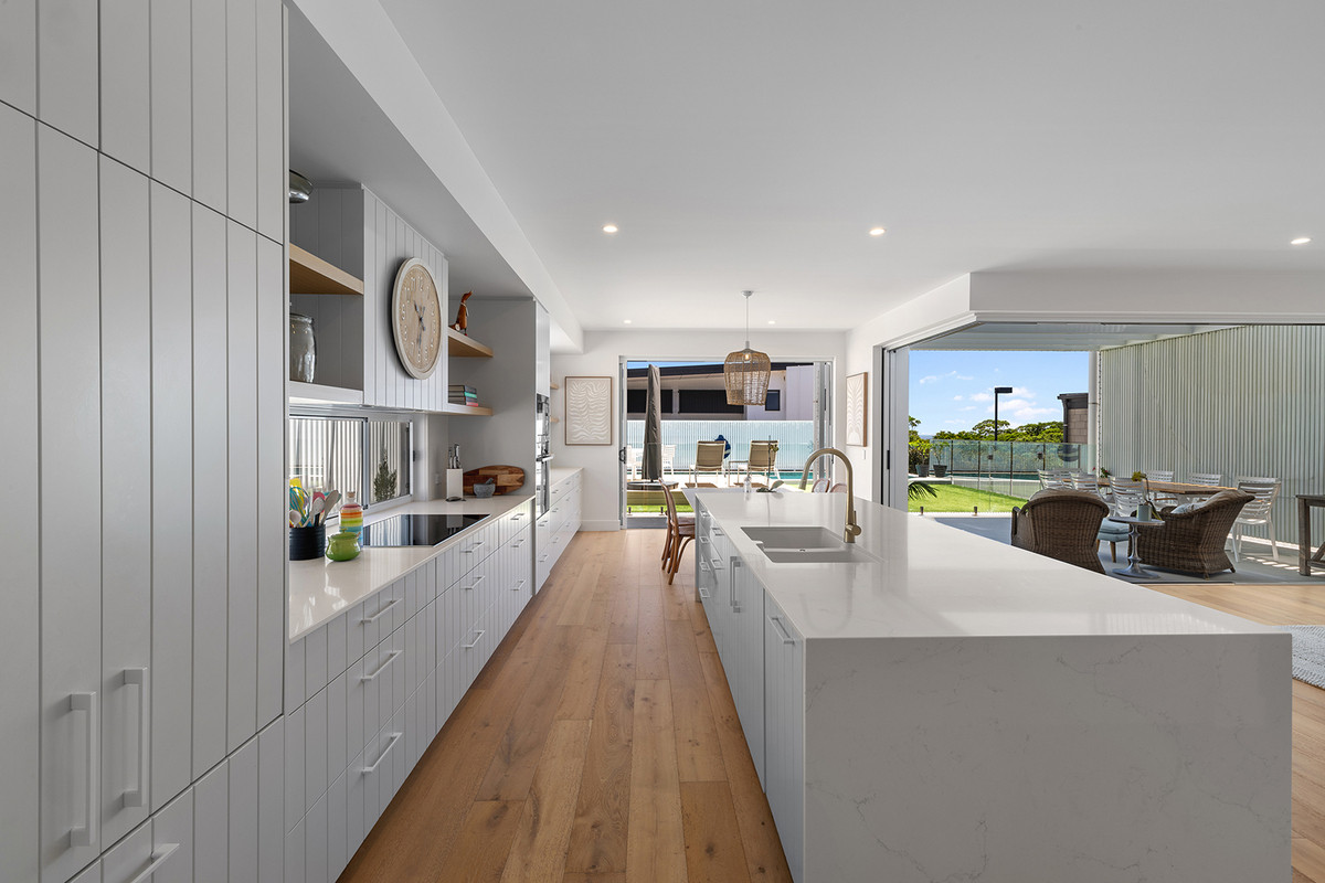 Set on a generous 637sqm allotment and constructed by an award-winning builder, this two-level residence has been thoughtfully finished using high-end natural materials in a soft, organic palette. VJ panelling, natural oak finishes, crisp white accents and stone surfaces work in perfect harmony, creating a relaxed yet refined coastal aesthetic.
