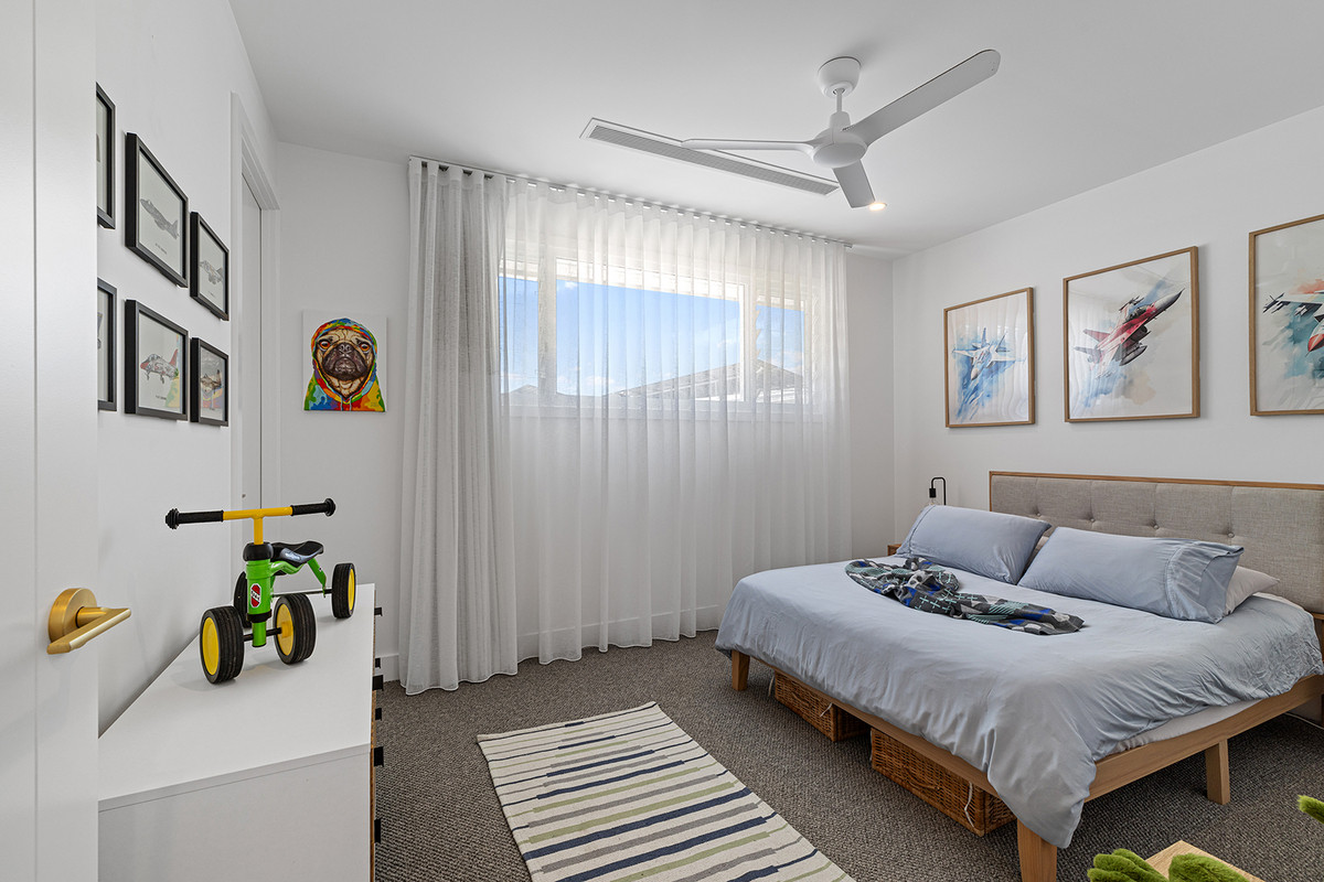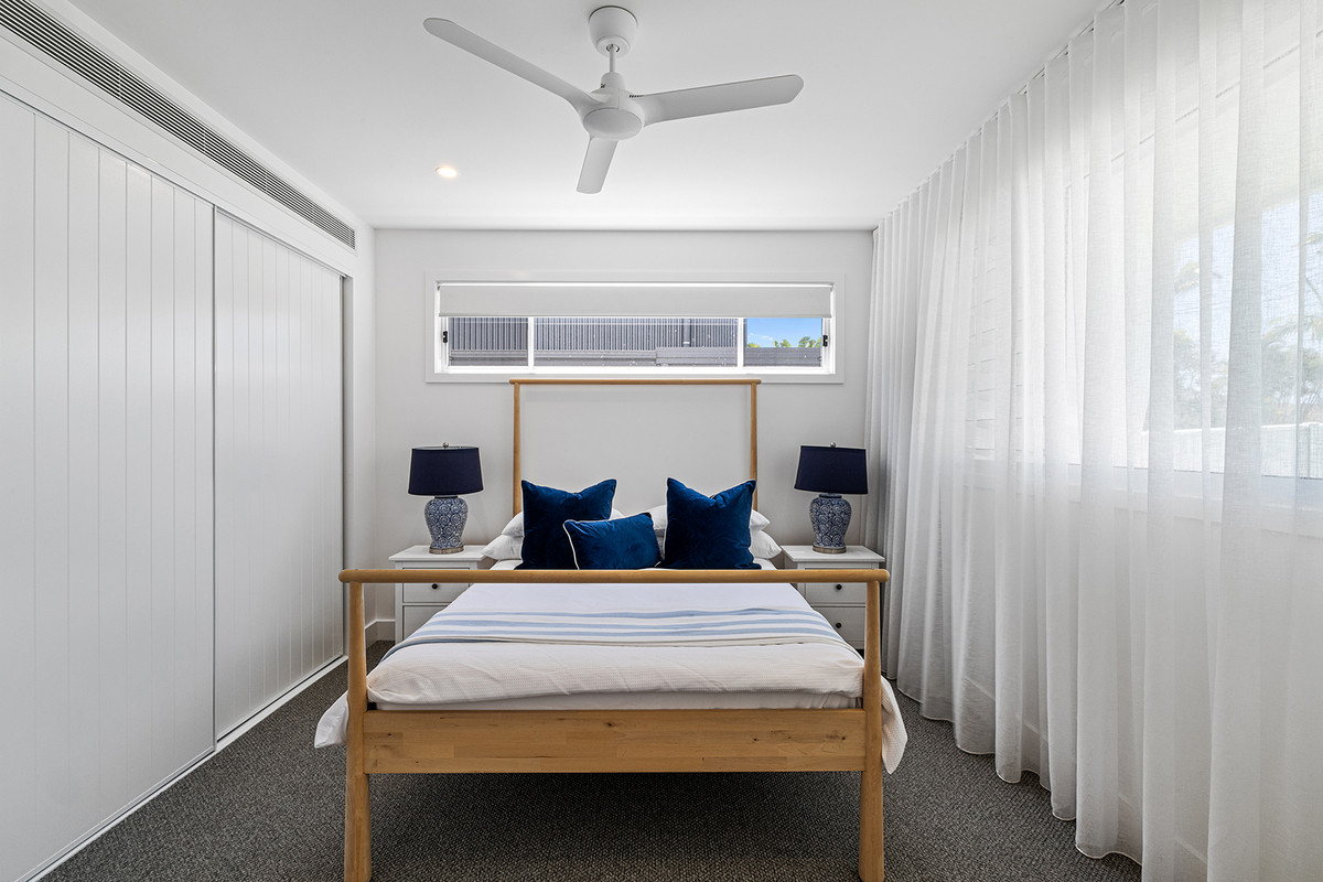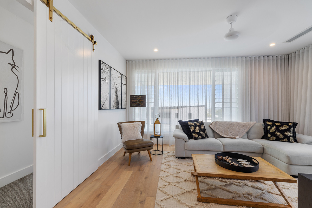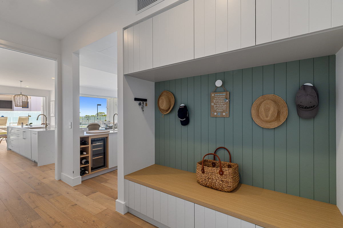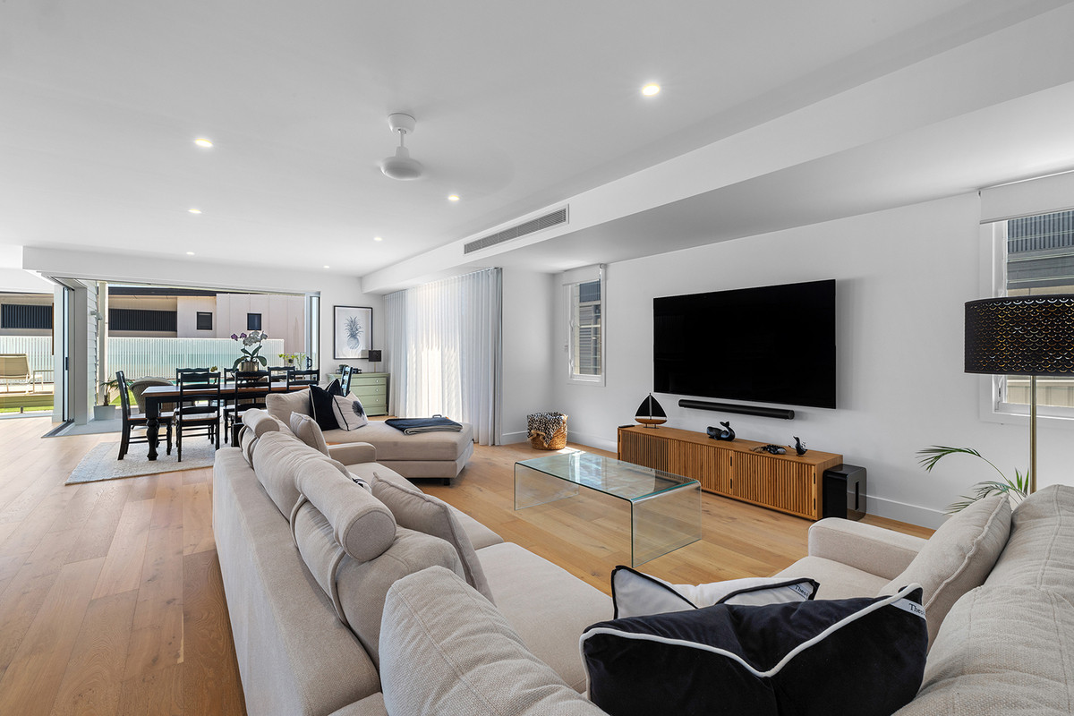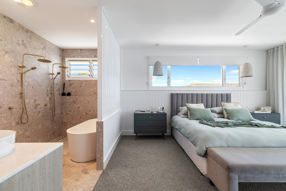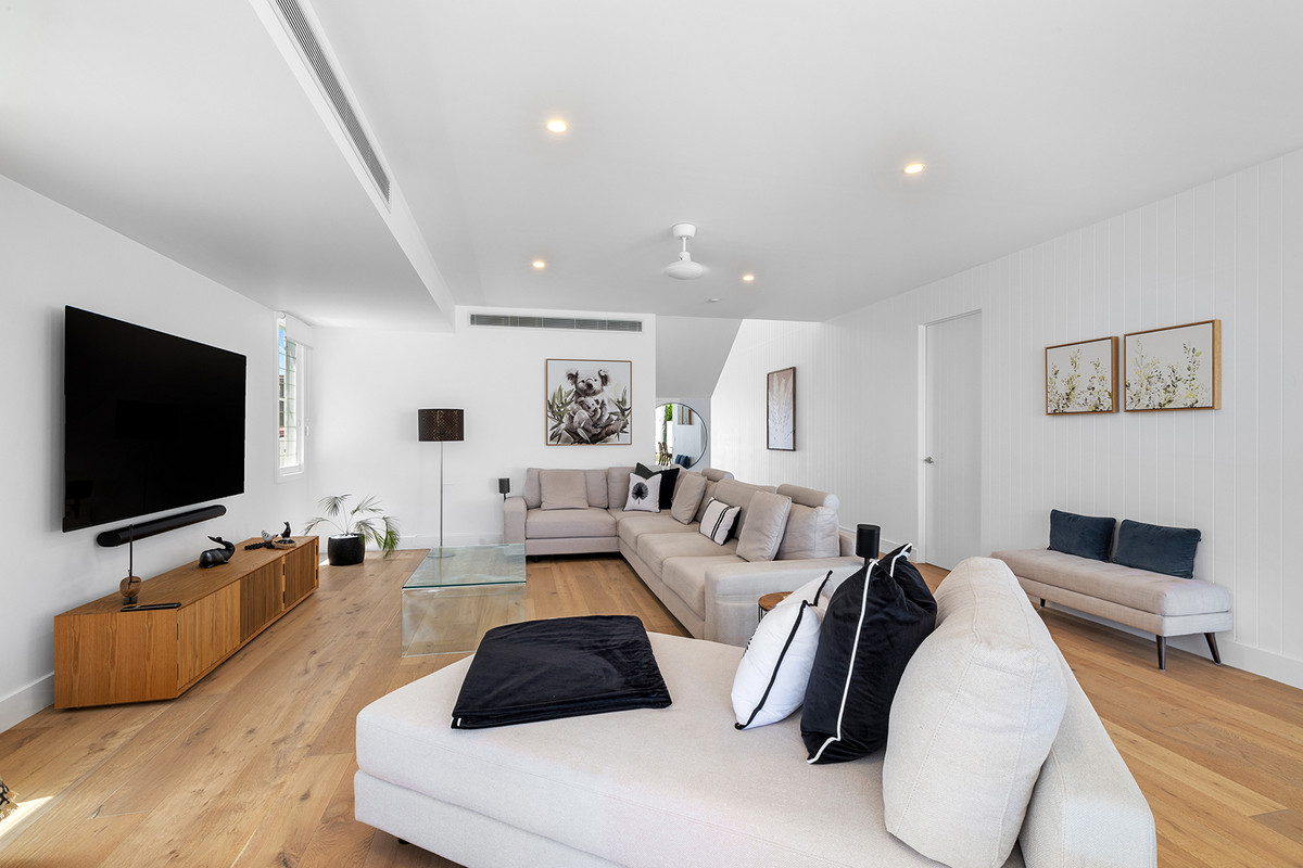 Set on a generous 637sqm allotment and constructed by an award-winning builder, this two-level residence has been thoughtfully finished using high-end natural materials in a soft, organic palette. VJ panelling, natural oak finishes, crisp white accents and stone surfaces work in perfect harmony, creating a relaxed yet refined coastal aesthetic.