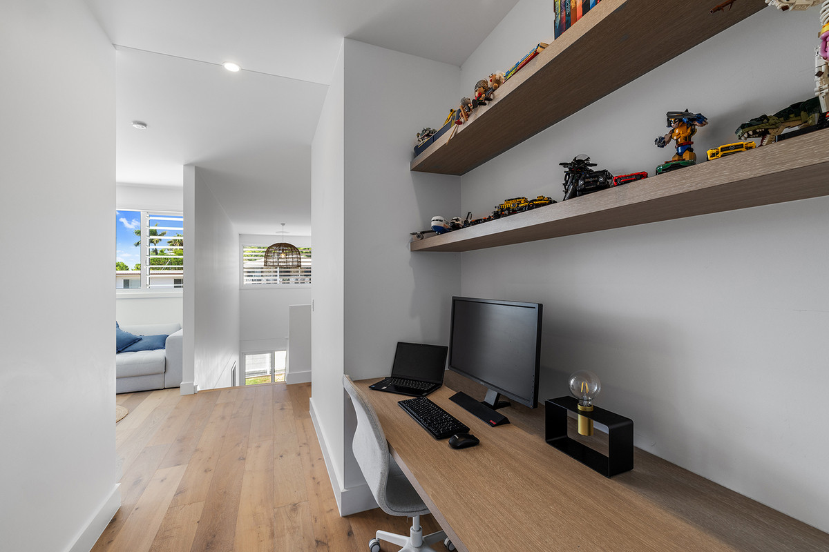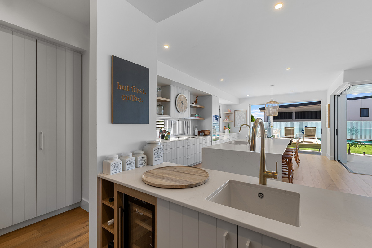 At the heart of the home, the designer kitchen delivers both style and functionality, featuring a statement stone island, brushed brass tapware, premium BOSCH appliances and generous storage discreetly concealed behind VJ cabinetry. Entertaining continues with a well-appointed wet bar, including a Triomph wine fridge — perfect for afternoon drinks.