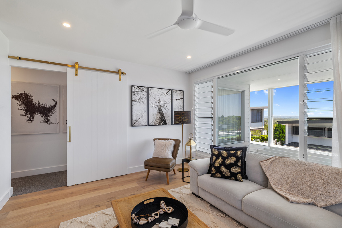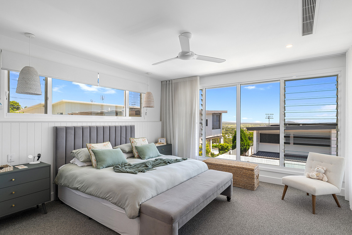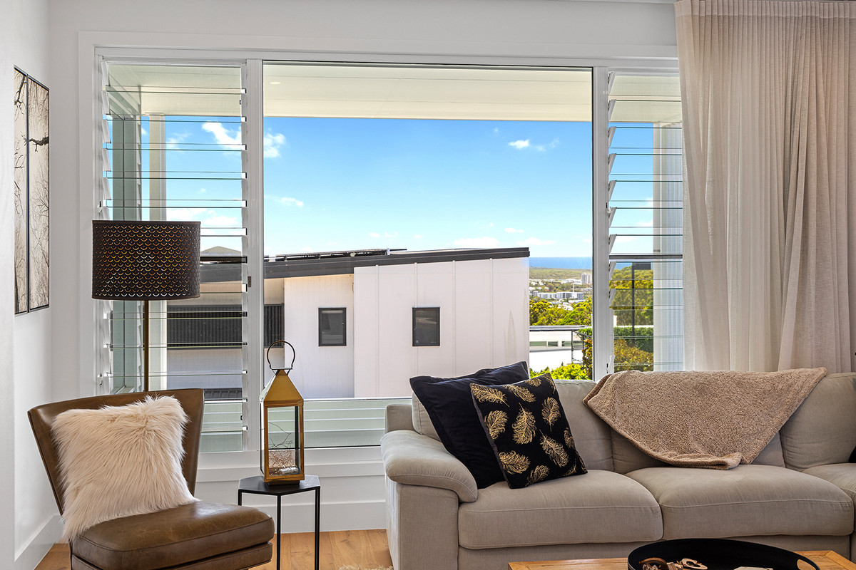 Perched high on the prized north-east escarpment, the home enjoys an elevated aspect with sweeping northerly views, capturing ocean glimpses and Mount Coolum beyond.