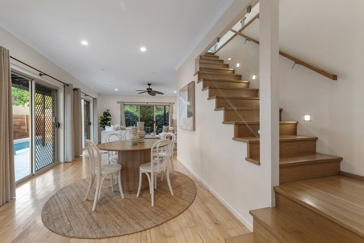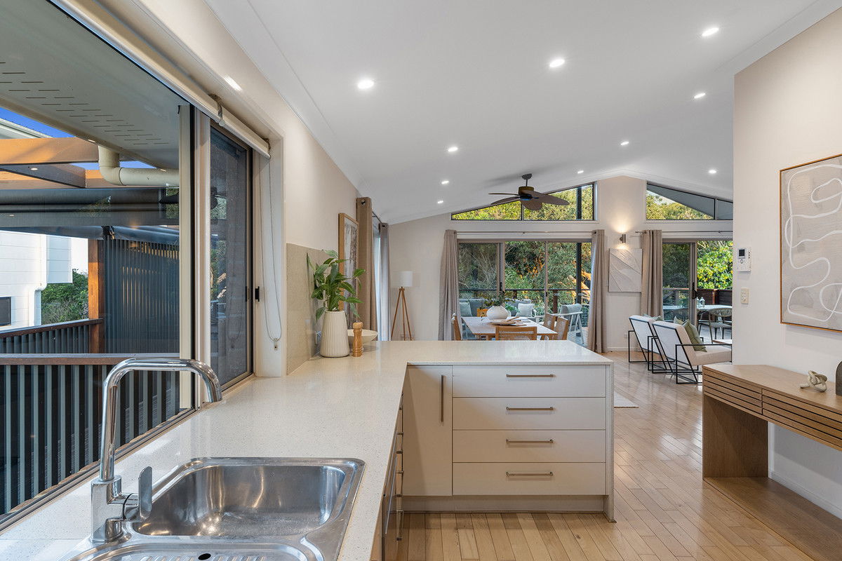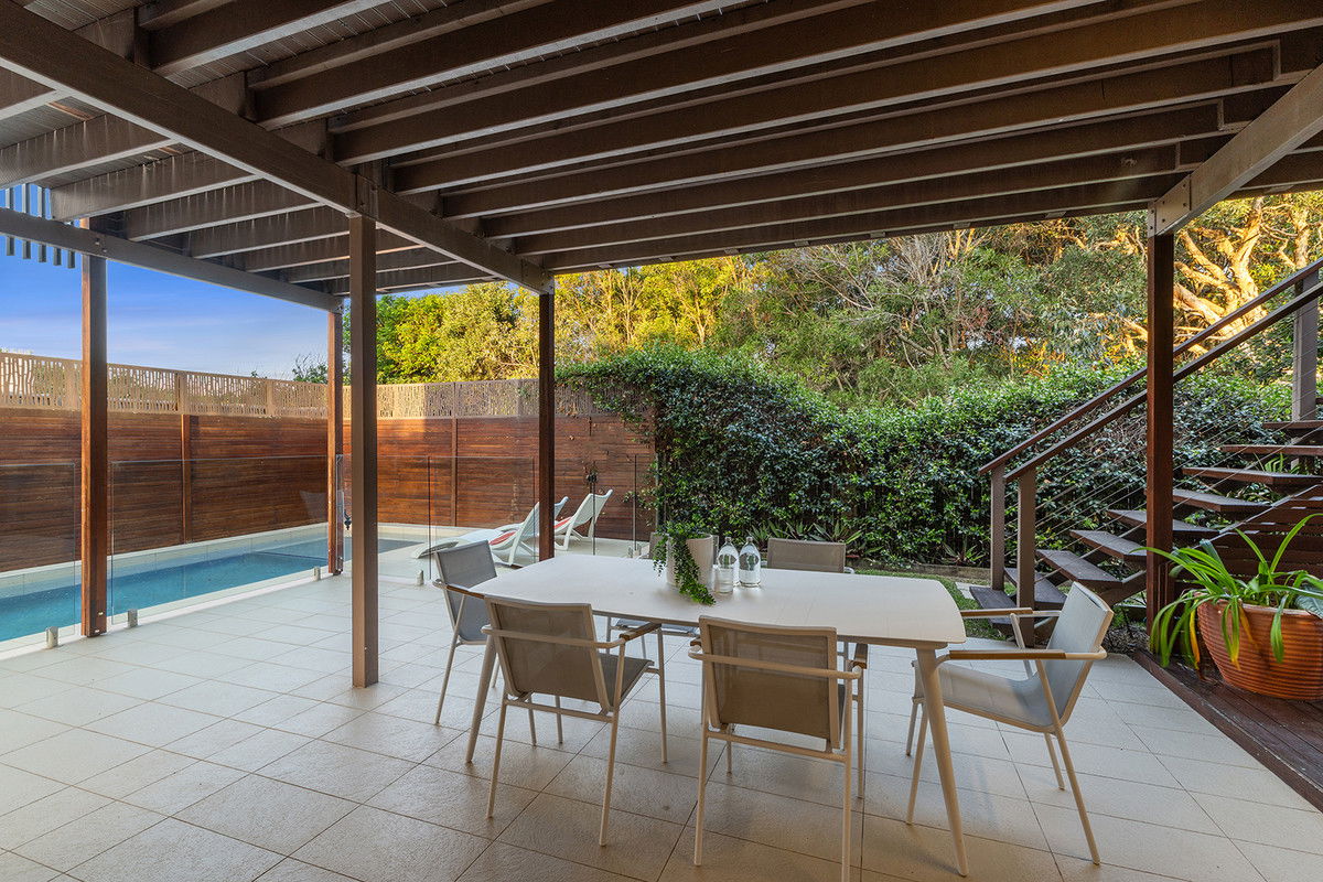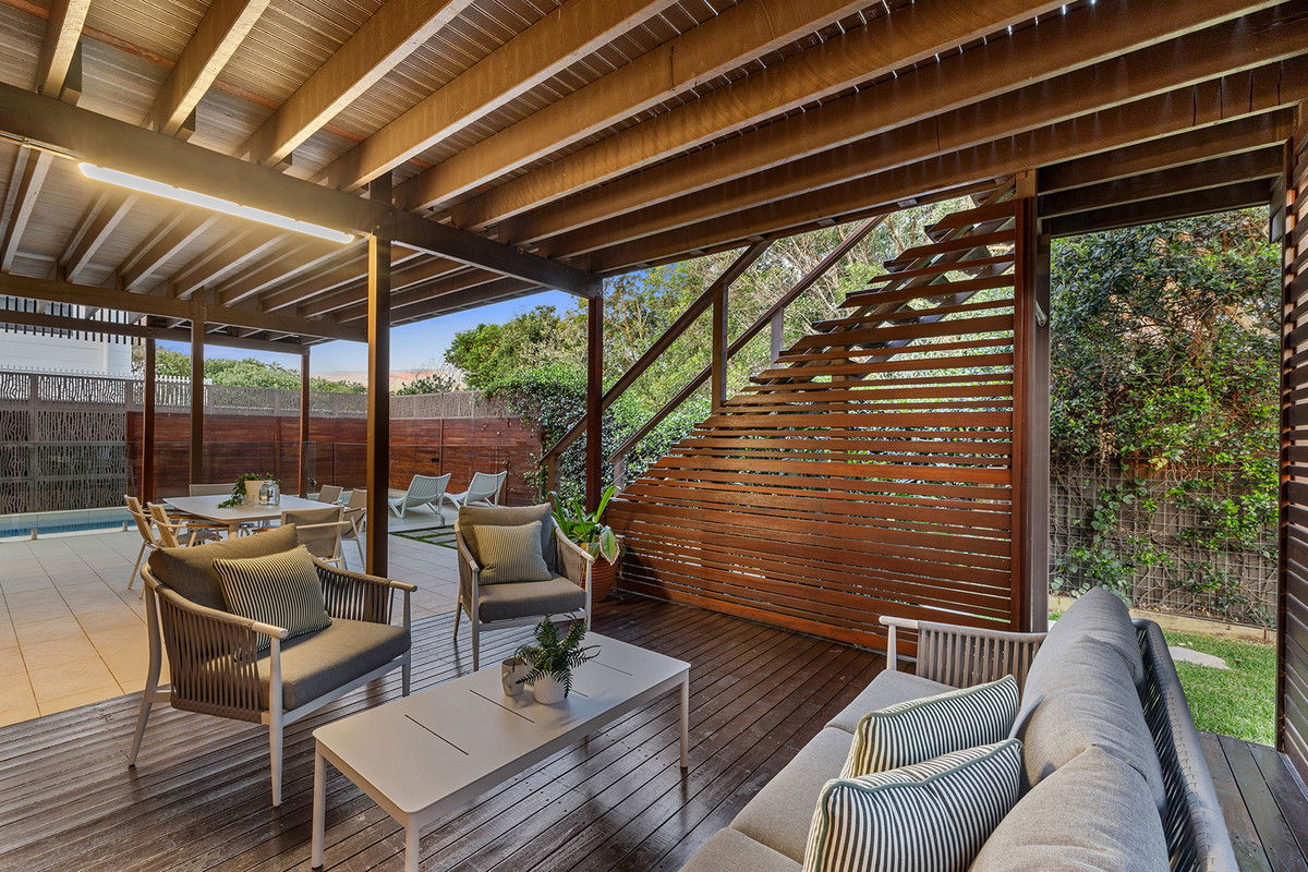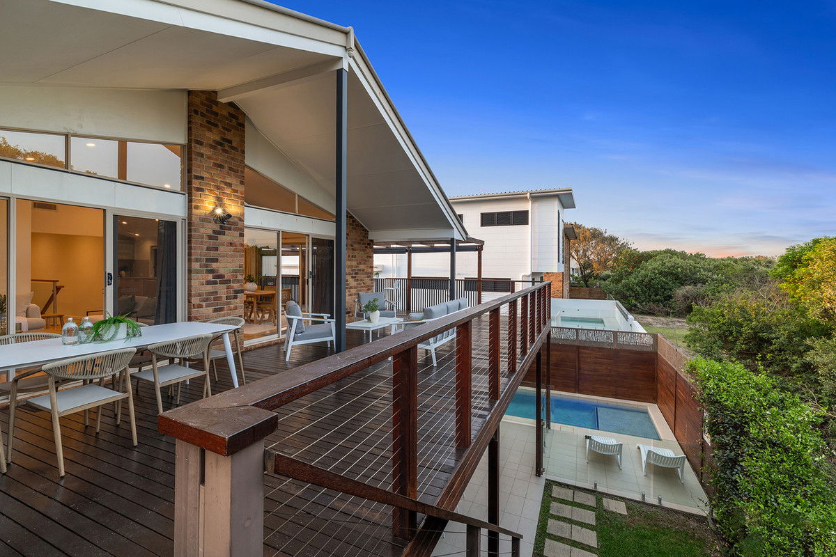 Upstairs, the open-plan living and dining areas flow effortlessly to wide, sunlit decks – the perfect vantage point to enjoy the sound of the waves and spectacular ocean outlook. Outside, multiple entertaining spaces and a sparkling pool create an inviting setting for weekend barbecues and endless summer days.