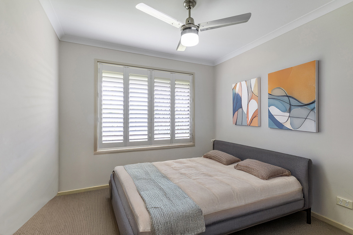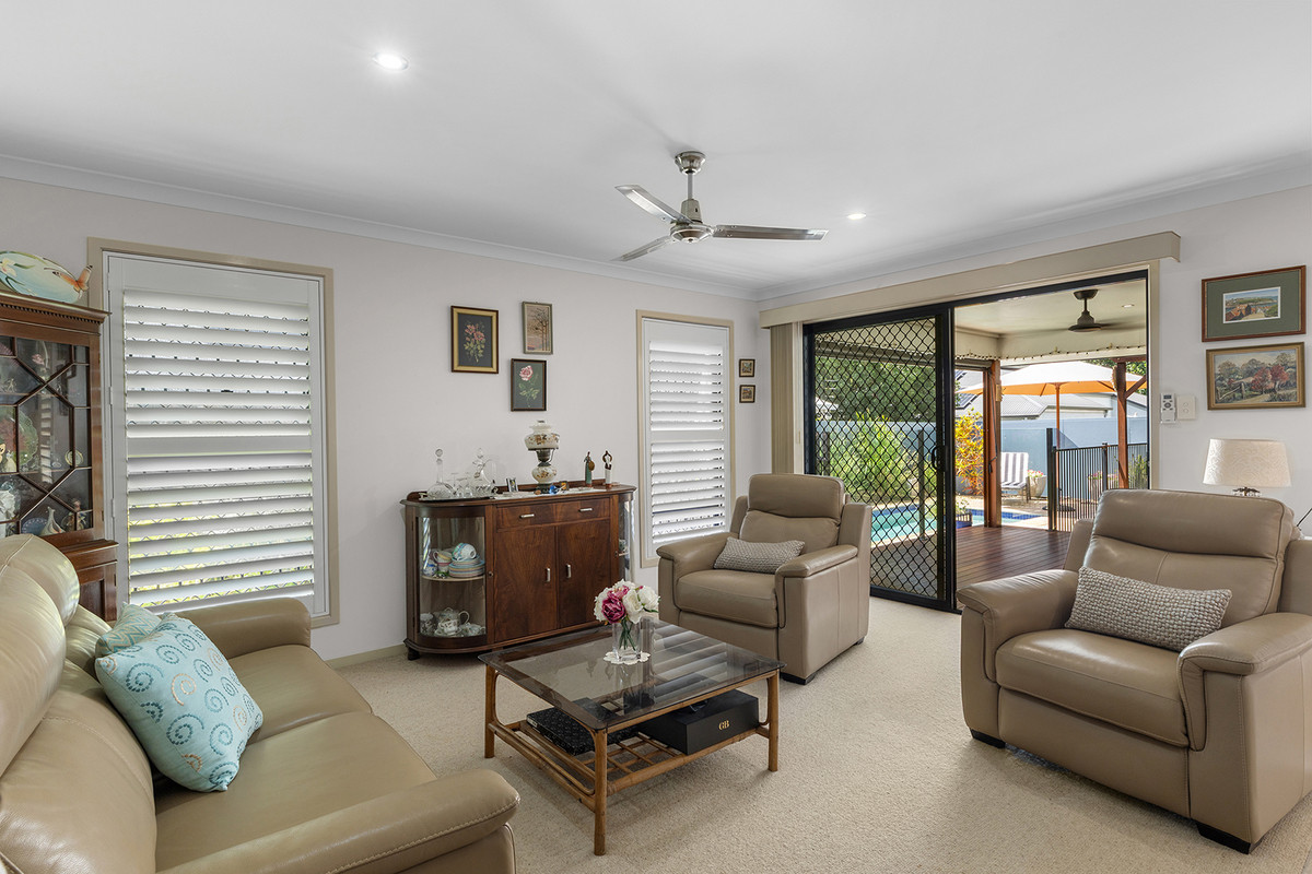 The spacious layout includes four generous bedrooms — all with plantation shutters — plus a master suite featuring a walk-in robe and stylish ensuite. The open-plan living and dining areas flow seamlessly to the outdoors, perfect for relaxed family living and entertaining.